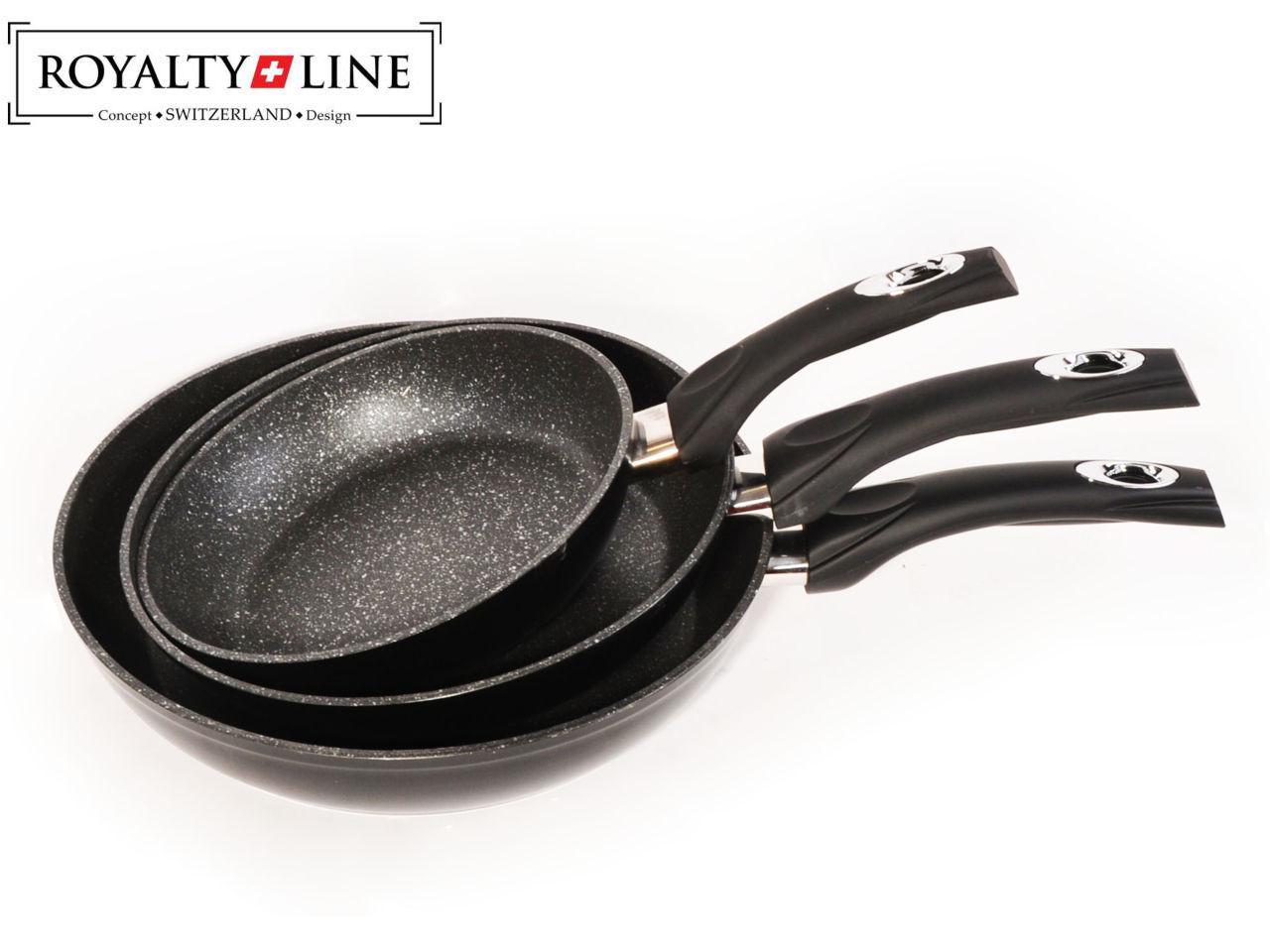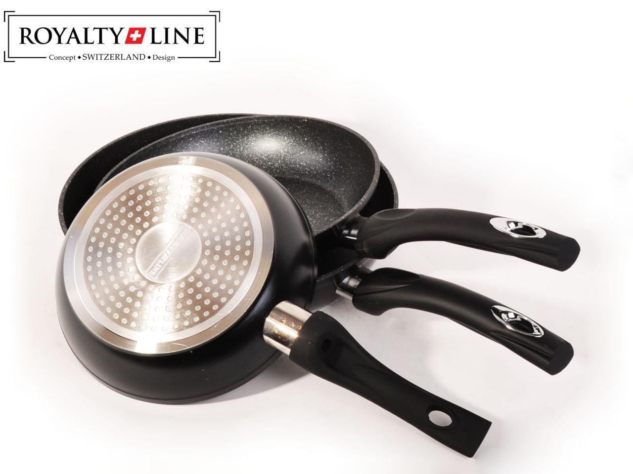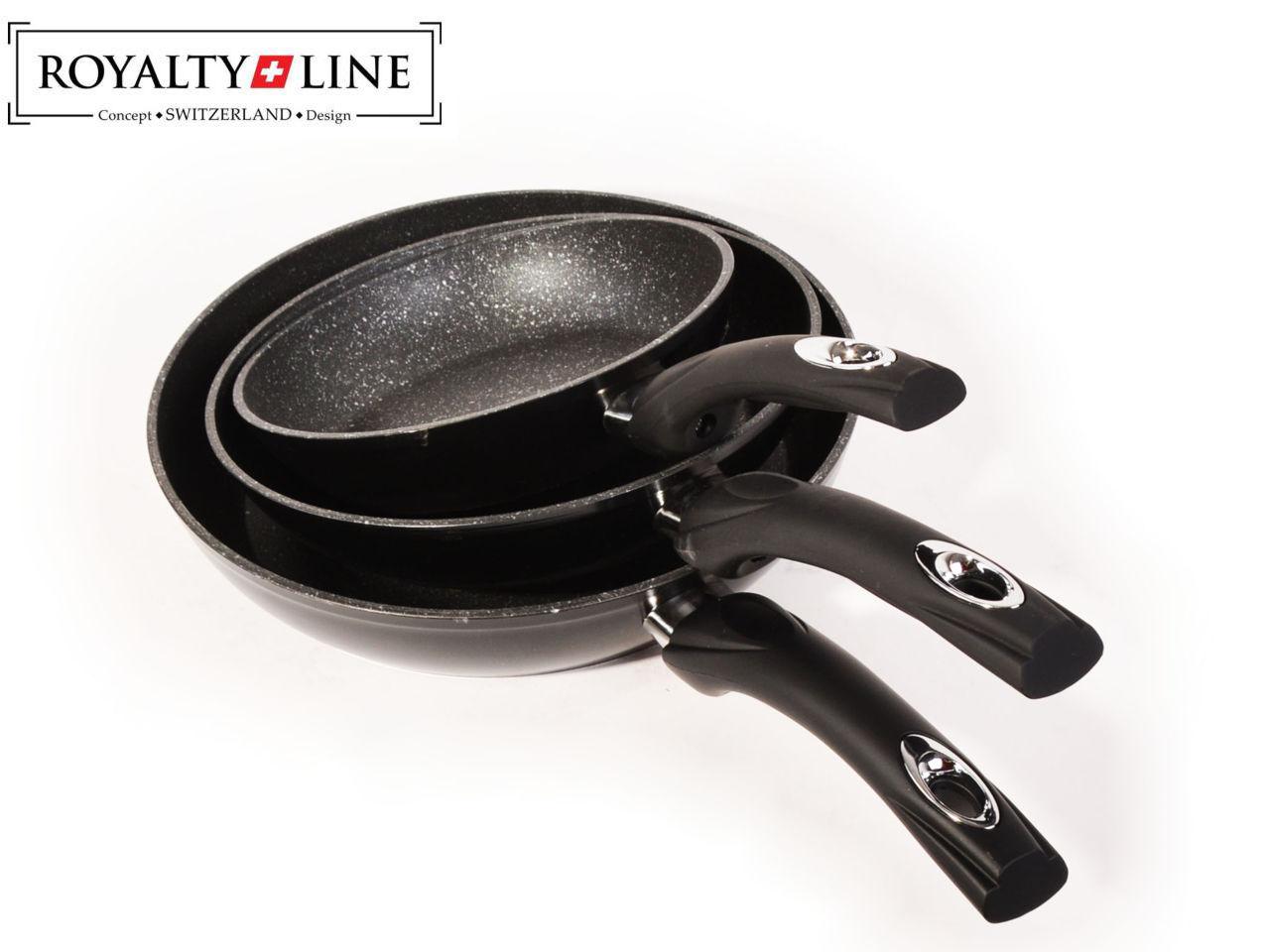 Sada 3 pánviček Royalty Line RL-FM3 zaujme na první dotek svou nízkou hmotností. Obsahuje pánve o průměrech 20, 24 a 26 cm. I tato sada je potažená mramorovou vrstvou, díky které potraviny nepřijdou do styku s kovem, takže si pokrmy zachovávají mnohem více živin. Celý popis