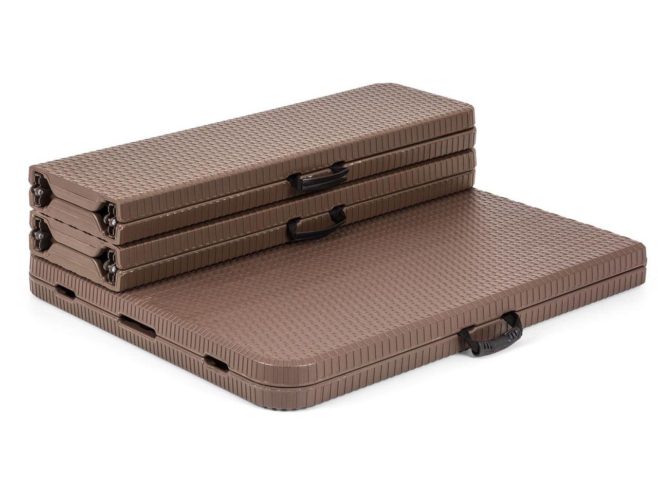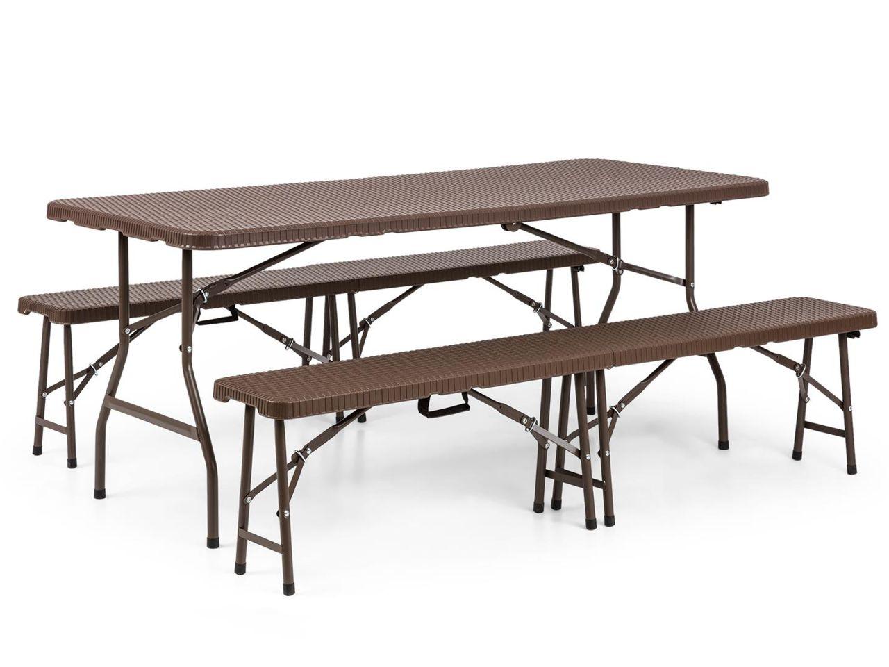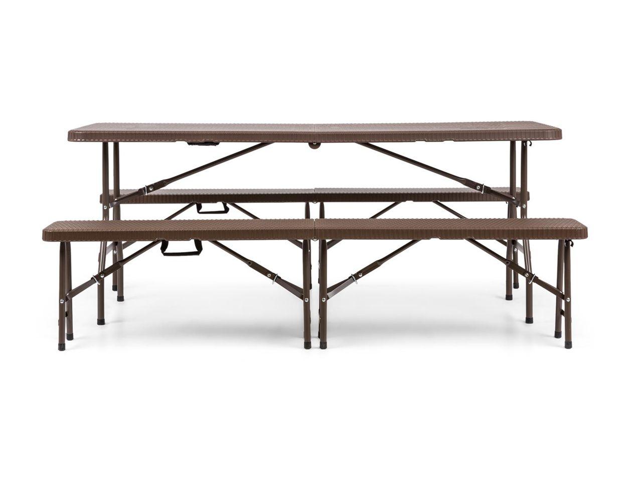 Přeměňte si zahradu, pokoj nebo terasu na místo plné zábavy za velmi krátkou dobu! S Triple Blumfeldt Burgos to není žádný problém! Dvě lavičky a jeden stůl pro 8 až 10 osob nabízejí dostatek prostoru pro oslavy a posezení. Stabilní práškově potažená konstrukce z upravených ocelových tyčí kombinovaná s HDPE na povrchu zajišťuje vysoké zatížení. Povrch je strukturovaný v ratanové nábytkové optice, která odpovídá zbytku zahradního nábytku. Obě lavice nabízejí zatížení 200 kg (každý), stůl dokonce až 300 kg. Bezpečnostní uzávěry na tyčích zajišťují stabilitu bez nepříjemných překvapivých okamžiků naklápění konstrukce. Pro snadnou přepravu je možné všechny díly snadno sklopit a držet pohodlně za rukojeti. Tím se také šetří místo při skladování