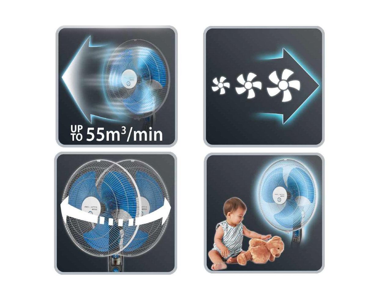 Ať už si Rowentu VU4210F0 pořizujeme do domácnosti, kanceláře nebo na chatu, záhy zjistíme, že jeho využití není třeba omezovat pouze na letní období. A to zásluhou jeho rozšířené funkce odhánět hmyz. Ventilátor o průměru 40 cm lze nastavovat ve třech režimech účinnosti, od jemného rozvíření stojatého vzduchu až po skutečné osvěžení. Při nastavení nejvyšší účinnosti vzduch proudí rychlostí až 55 m3 za minutu, díky čemuž je schopen naplnit požadavky i náročných uživatelů. Nejsou proto od věci kovové mřížky, jež chrání průzračně modré listy vrtule.