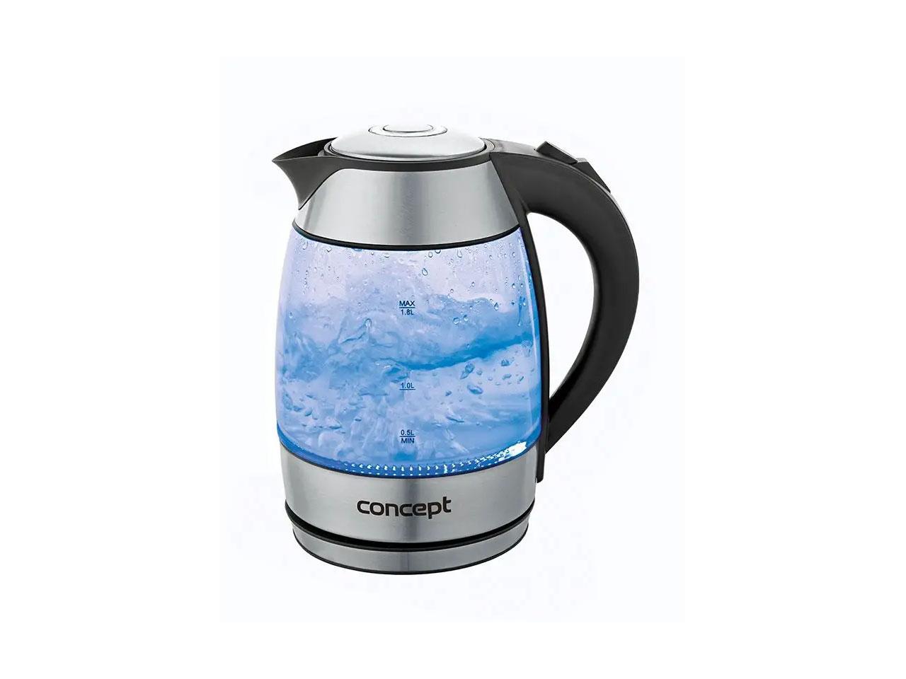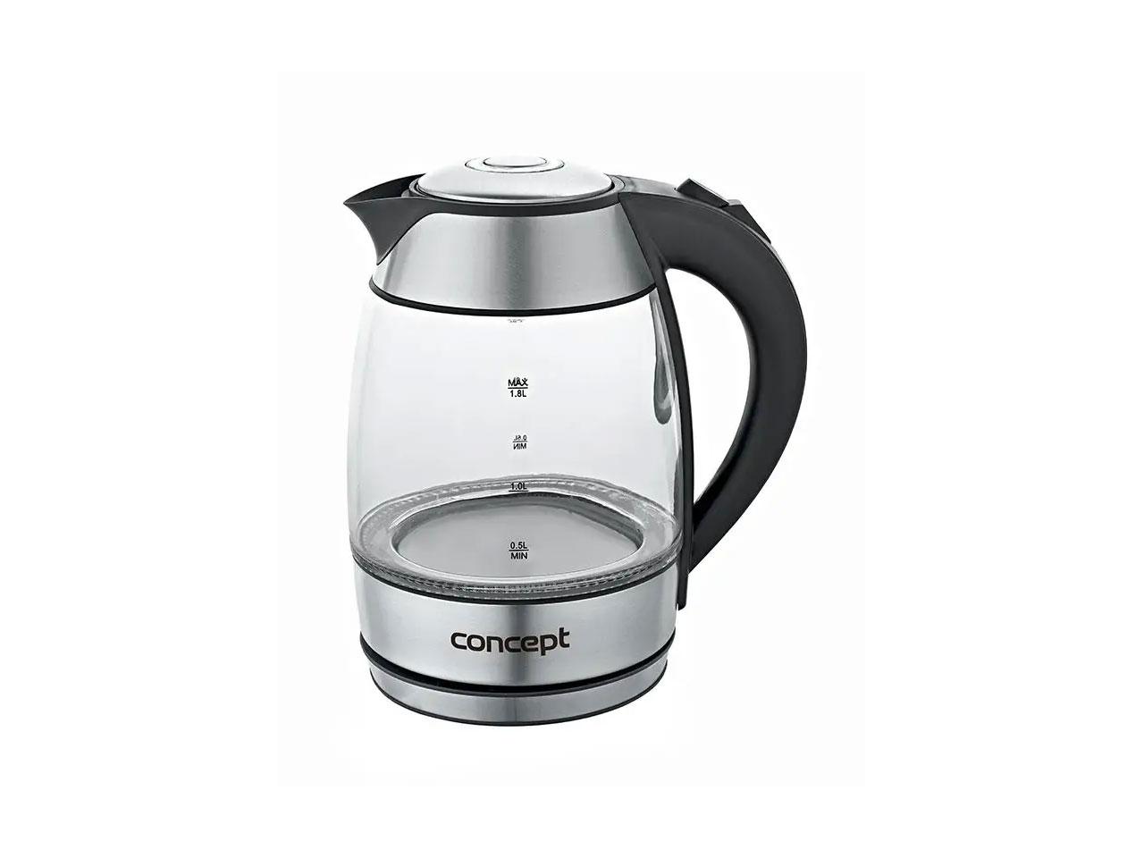 Rychlovarná konvice Concept RK 4050 v nerezové barvě. Konvice je vyrobená z velmi pevného, zdravotně nezávadného borosilikátového skla odolného proti skvrnám. Skleněná konvice vám umožní snadno kontrolovat množství vody uvnitř. Kovový lem okolo hrdla konvice zabezpečí větší odolnost konvice při neopatrné manipulaci během plnění vodou. Velký objem 1,8 l vám umožní uvařit vodu na čaj pro celou rodinu najednou. Ani návštěva nebude muset čekat. Celý popis