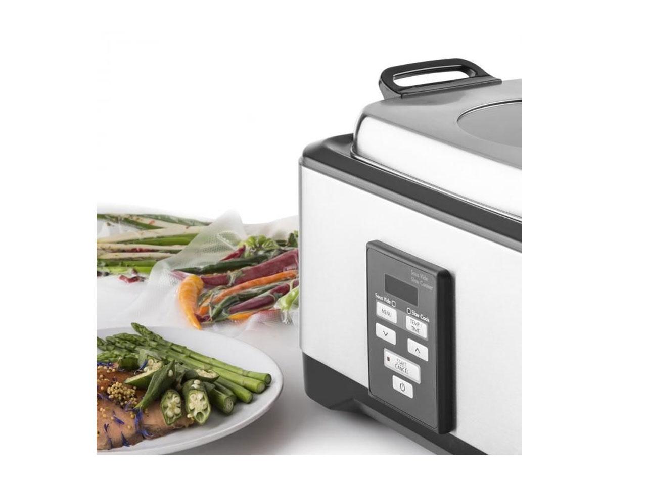 Výkonných 550 W přivádí odnímatelný, nepřilnavý, 8 l hliníkový vnitřní hrnec pomalého hrnce rovnoměrně na teplotu 40 až 99 °C a zajišťuje úspěšné zahřátí potravin. Teploty mohou být nastaveny v krocích po 0,5 °C. Čas vaření lze nastavit v krocích po 10 minutách od 1 hodiny do 24 hodin - perfektní pro dosažení požadovaného stavu jídla. Všechna nastavení lze uskutečnit pomocí jednoduchého ovládacího panelu na přední straně zařízení. LED displej podporuje volbu i opticky.