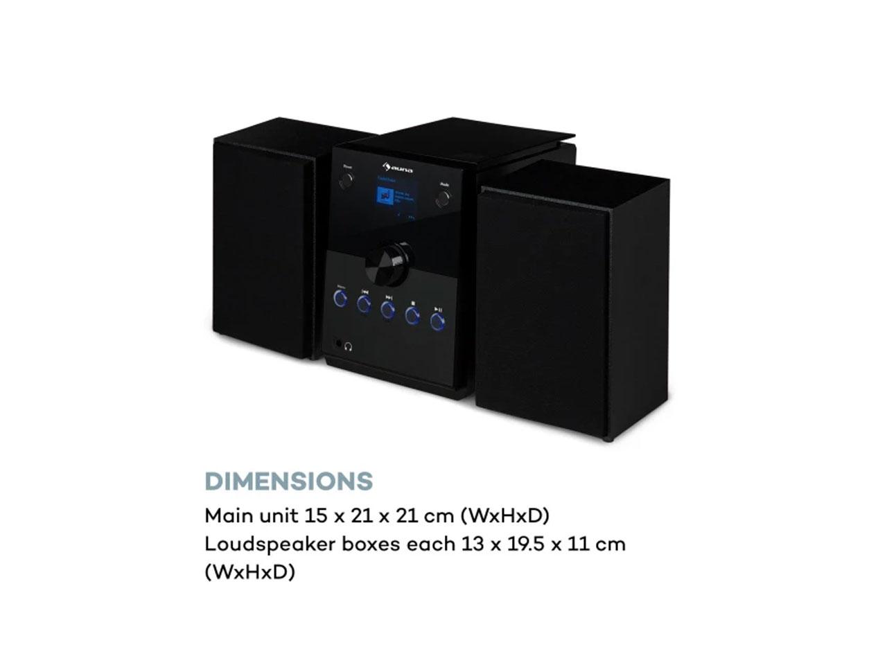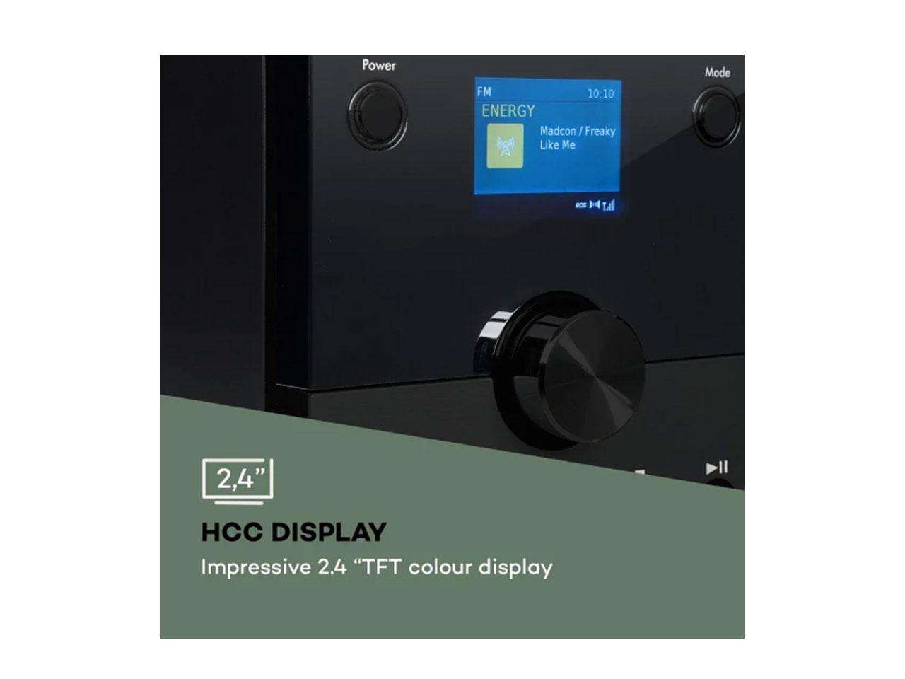 Kromě toho lze používat linkový vstup na zadní straně, který snadno rozšiřuje zvukový systém o další zvukové obsahy z externích zařízení. Stereo systém se ovládá pomocí ovládacího panelu na přední straně nebo pohodlně pomocí dálkového ovladače. Na barevném a dobře čitelném HCC displeji se zobrazuje mnoho užitečných informací o rádiových stanicích nebo o aktuálně běžící skladbě. Oba kompaktní stereo reproduktory s RMS výkonem po 3 W se vyznačují dynamickým zvukem, výstup pro sluchátka umožňuje tichý poslech hudby.