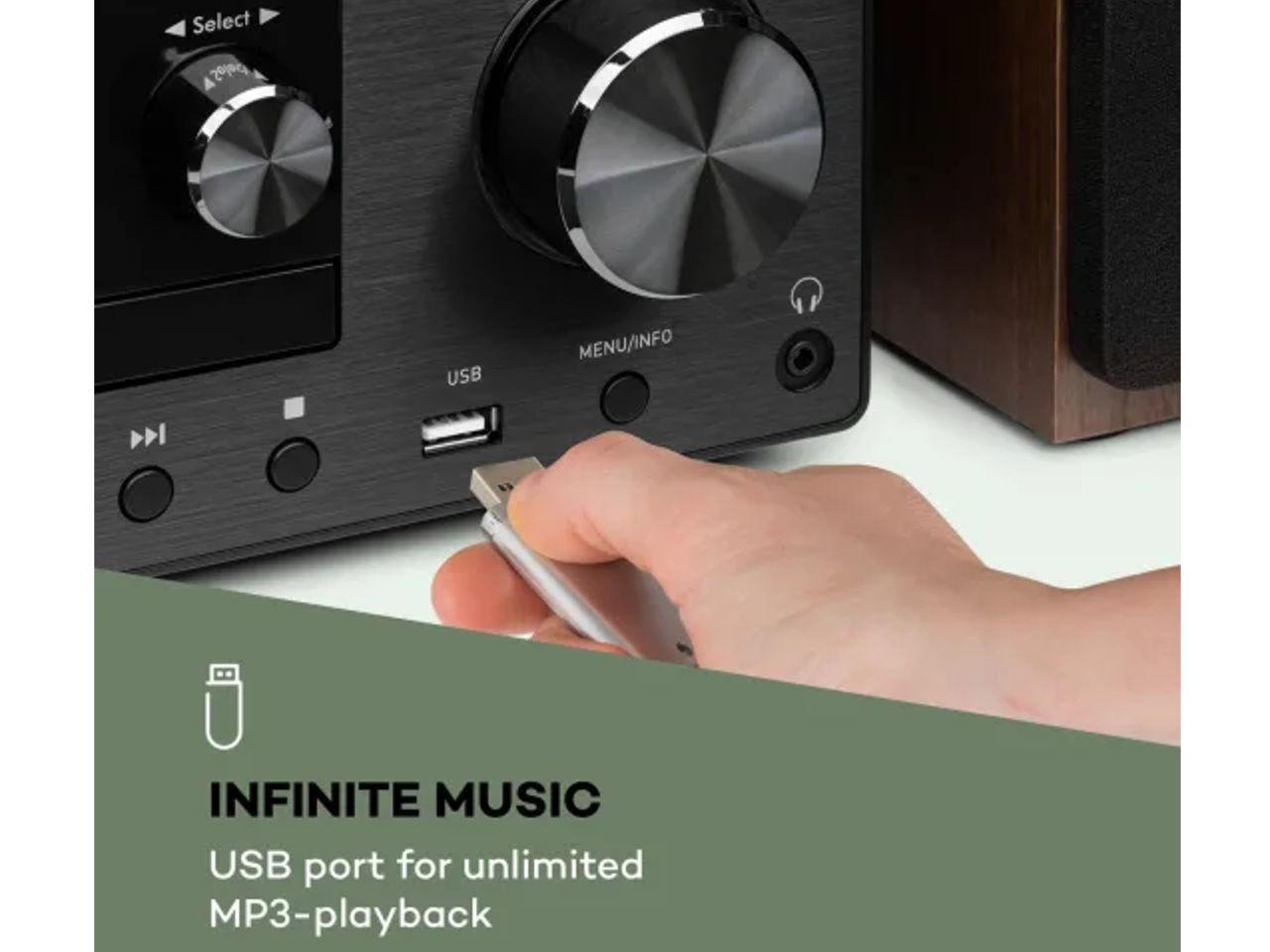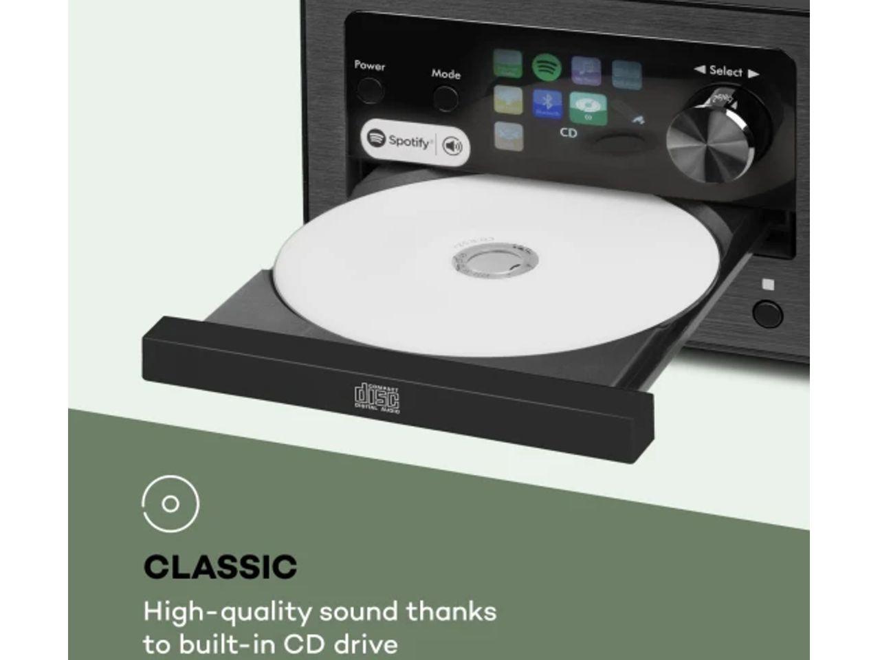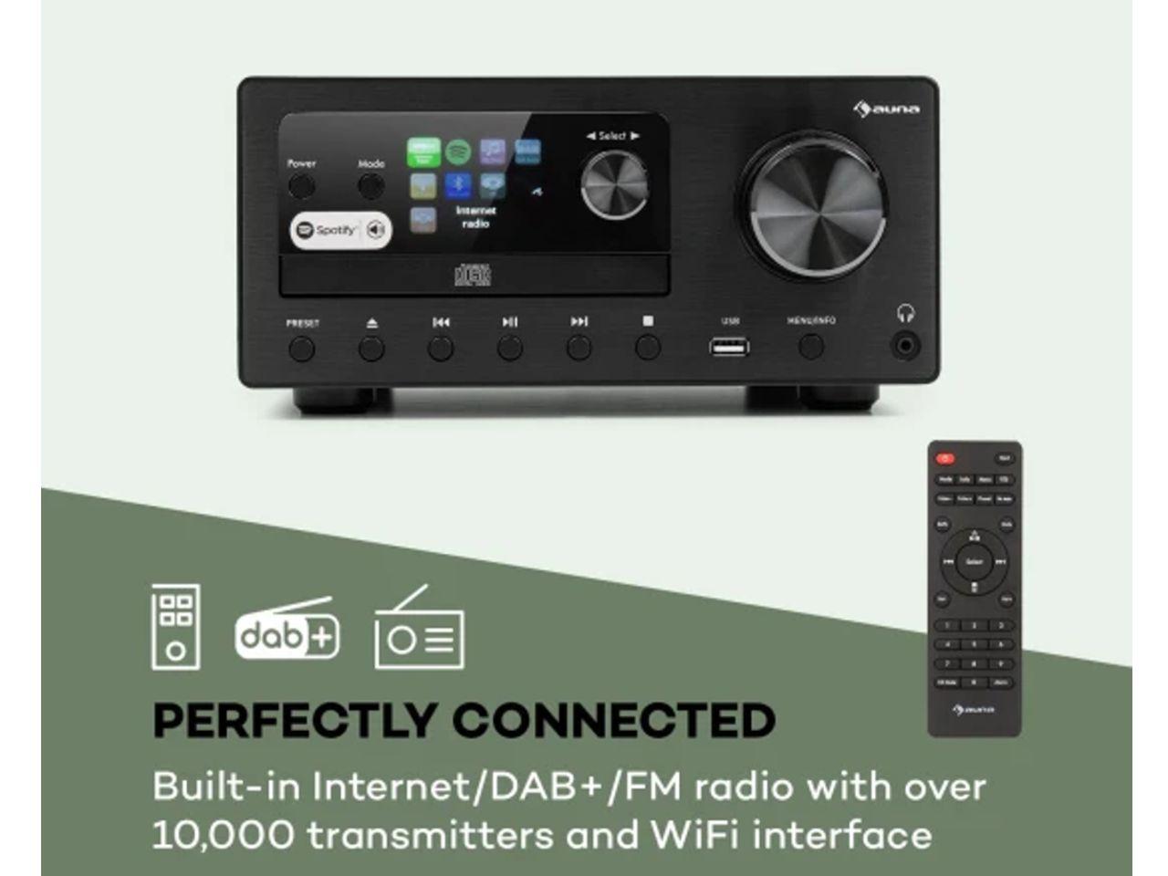 Systém s integrovaným internetovým / DAB + / FM rádiem přijímá až 10 000 stanic a má vestavěnou Wi-Fi, klasický CD přehrávač, USB port pro přehrávání MP3 a vstup AUX. Zvláště by se mělo zmínit bezdrátové připojení Bluetooth s rozšířením Spotify Connect, které zajišťuje spolehlivé streamování hudby v systému Connect prostřednictvím smartphonu, tabletu nebo notebooku. Funkce Multiroom také umožňuje konfigurovat zařízení jako součást skupiny zařízení pro více místností, kterou je možné ovládat přes tutéž síť Wi-Fi.