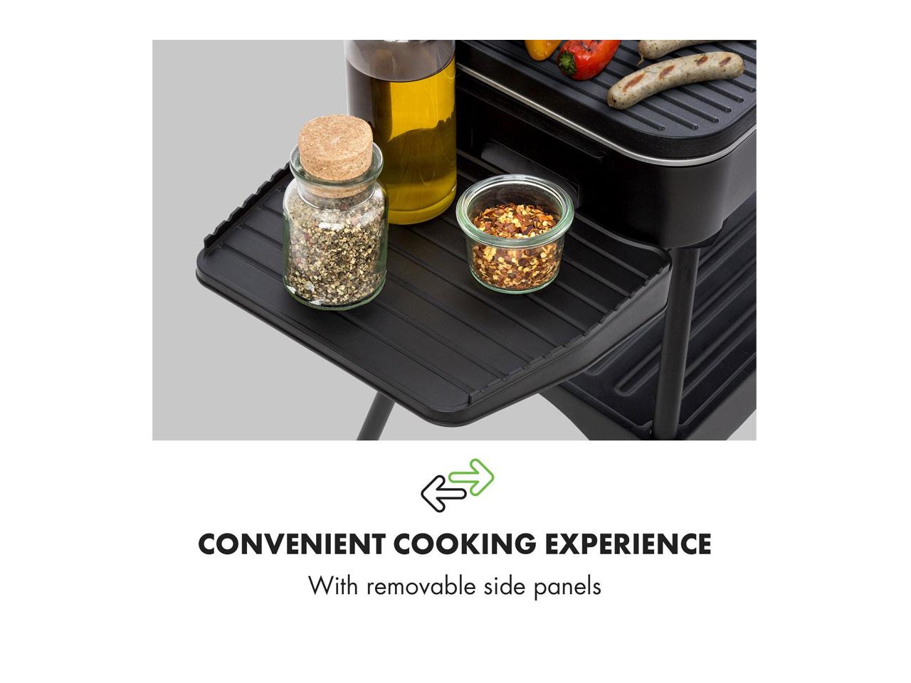 Na stojanu elektrického grilu Porterhouse je praktická police na grilované jídlo, kleště nebo jiné užitečné pomůcky. Dodatečné možnosti skladování vznikají z odnímatelných bočních dílů, které jsou ideální například na koření nebo omáčky.
