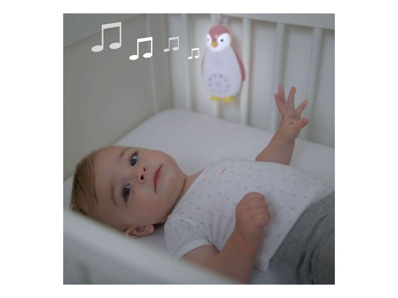 Můžete aktivovat i snímač zvuku, díky kterému se zapne hudba nebo světlo, pokud začne dítě v noci plakat (aktivuje se cca po 3 vteřinách pláče, ne ihned, aby se neaktivoval např. pouze při zakašlání)