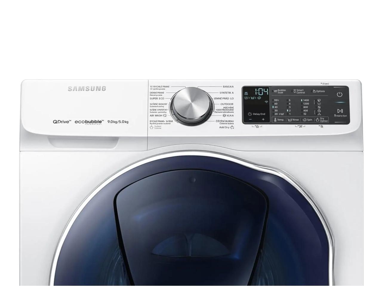 Předem plněná pračka Samsung Quick Drive™ WD90N642OOM/ZE zastane najednou velký kus práce, vypere totiž až 9 kg prádla a pomohou vám k tomu klasické prací programy Bavlna, Syntetika, Jemné či Máchání/Odstřeďování doplněné nadstandardními programy jako Air Wash pro dlouhodobou svěžest bez pachů a bakterií pomocí teplého vzduchu, Vlna, Super Eco Wash, Denní praní, Outdoor a funkcí ekologického čištění bubnu Eco Drum Clean+. Se sušením si poradí několik sušících programů pro bavlnu a syntetické materiály. Překvapí vás jednoduchá obsluha pomocí ovládacího panelu na čelní straně pračky. Na levé straně se nachází zásobník na prací prášek a aviváž, středovým otočným knoflíkem nastavíte vybraný prací nebo sušící program a na pravé straně zvolíte teplotu, úroveň sušení, otáčky při odstřeďování a jiné funkce prostřednictvím přehledného grafického LED displeje.