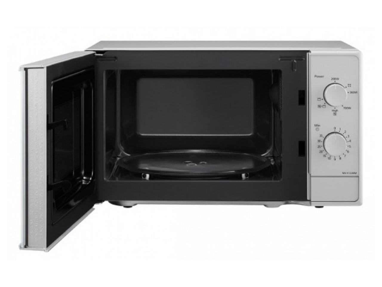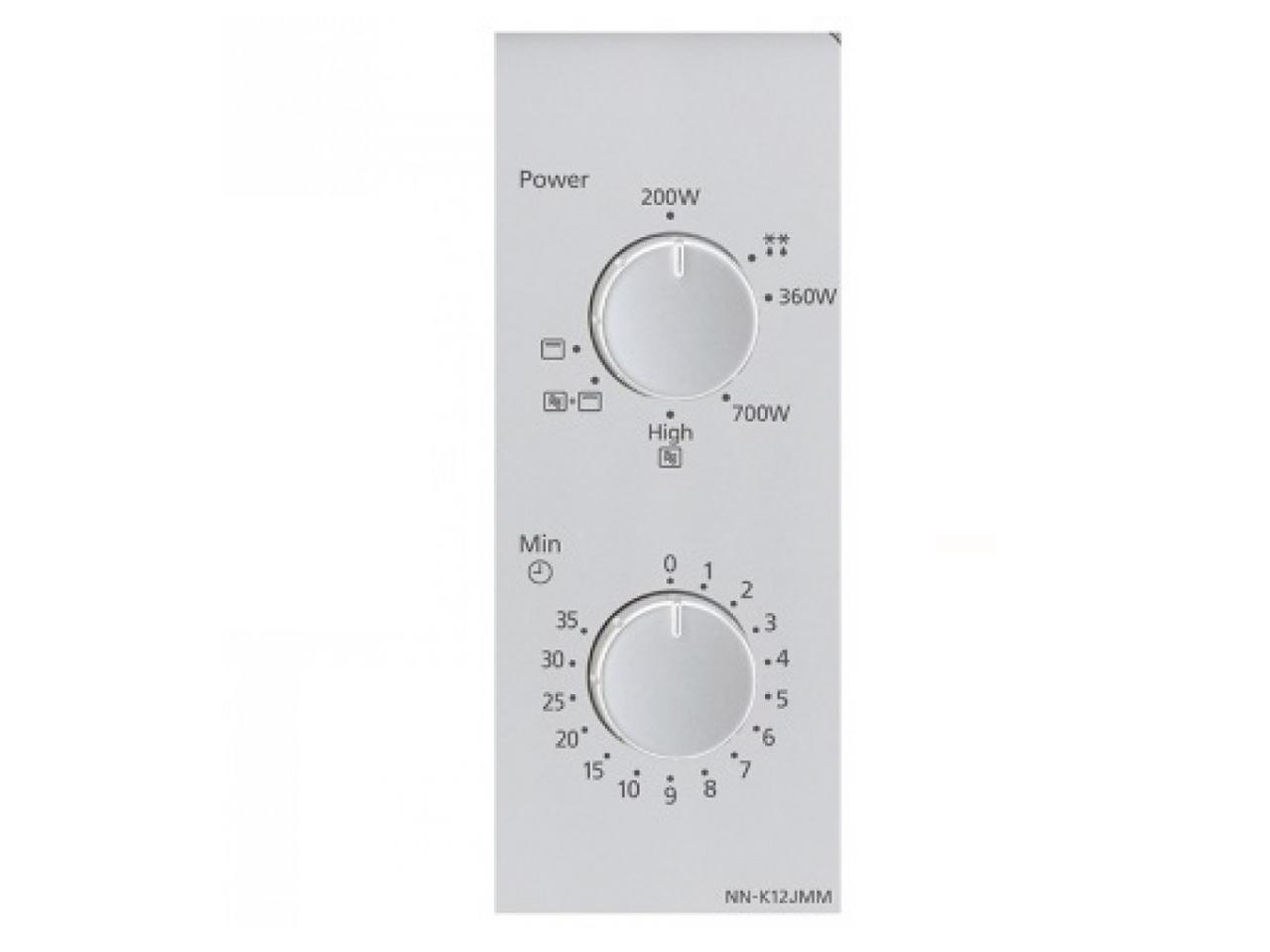 Vnitřní akrylově šedý prostor má objem 20 l. Nachází se v něm skleněný otočný talíř s průměrem 25,5 cm. Ovládání mikrovlnné trouby Panasonic NN-K12JMMEPG je zajištěno pomocí mechanického ovládání dvěma otočnými voliči. Dvířka se otevírají pomocí tlačítka.