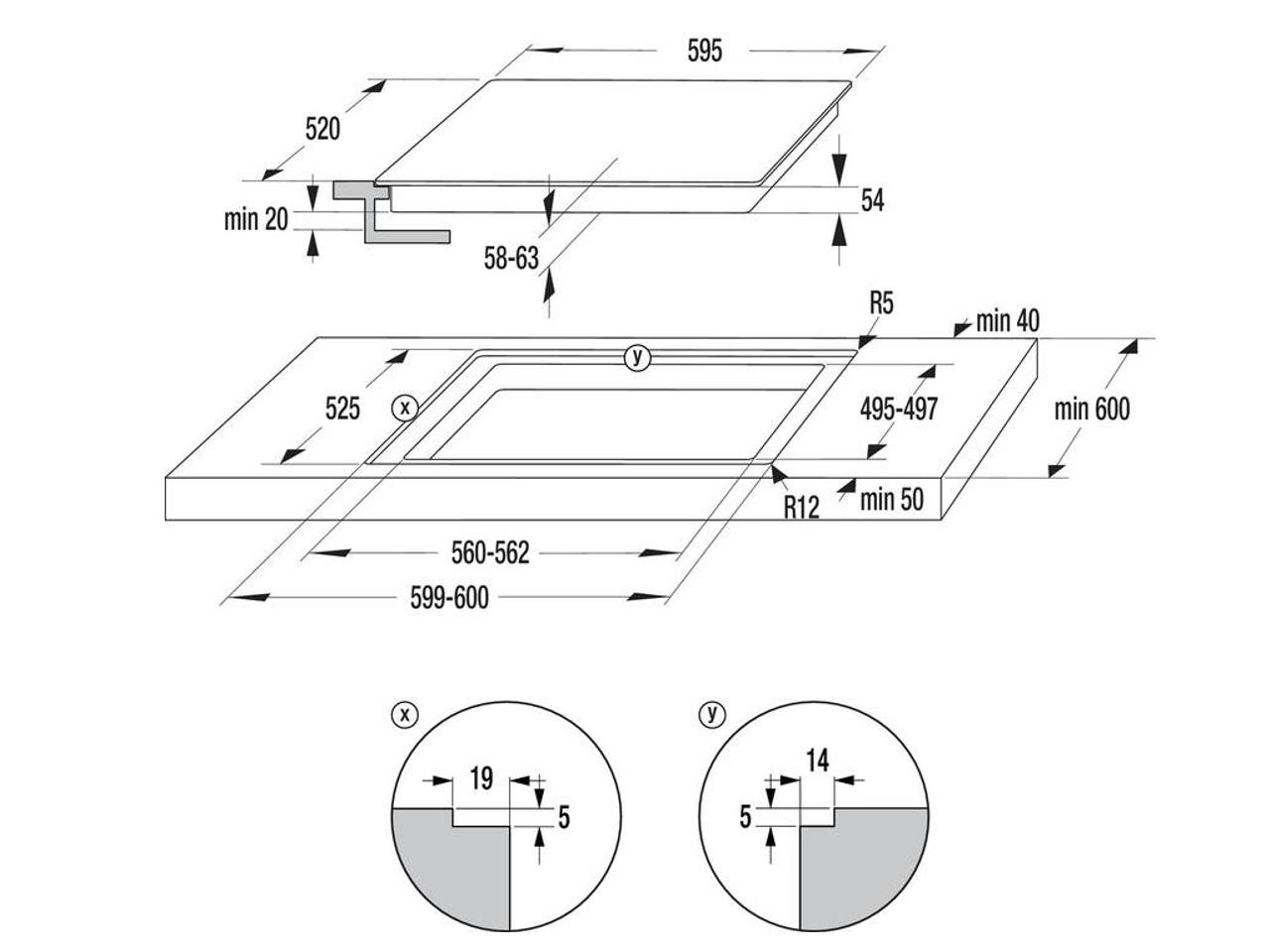 Otvor pro vestavbu: v x š x h: 74 × 560-562× 490 mm