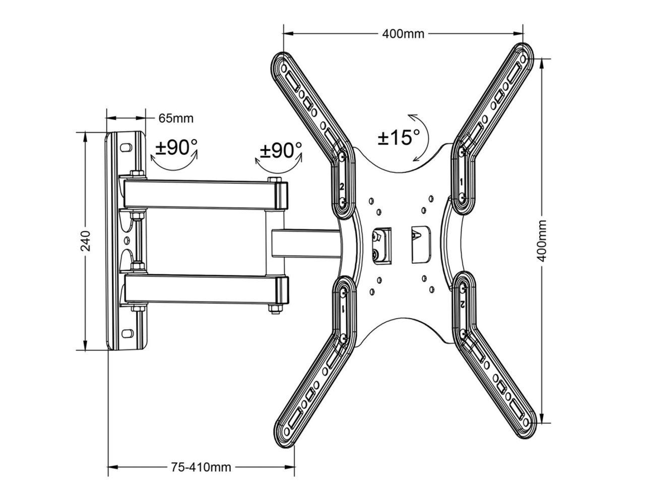 Držák, který je vhodný pro zavěšení televize na stěnu a nastavení obrazovky do požadované polohy - otáčení do stran, nastavení vzdálenosti od zdi, náklon. Držák podporuje VESA standardy 75x75 až 400x400, zavěsit můžete televize s hmotností do 30kg. Součástí balení je sada instalačního materiálu - hmoždinky, vruty, šrouby, podložky.