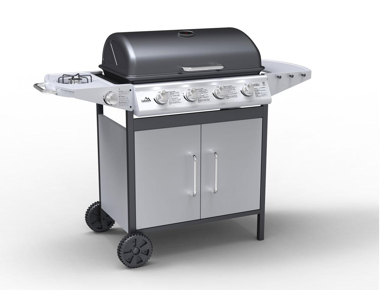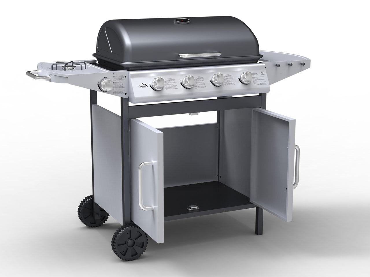 Gril je pojízdný (2 kolečka), je vybaven sklopným víkem s teploměrem a odkládacími poličkami s háky na příslušenství. Dále je vybaven přídavným bočním vařičem se samostatnou regulací a piezo zapalováním. Ve střední části je uzavíratelná skříňka s dvířky. Součástí je i spojovací hadice k plynové lahvi a redukční ventil. Díky sklopné boční poličce se gril snadno skladuje.