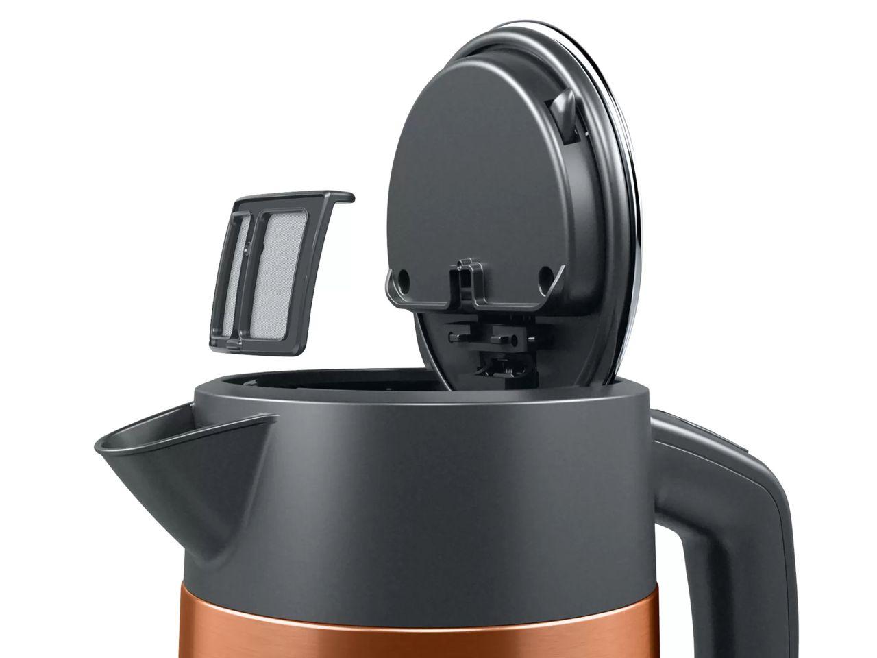 Varná konvice v nerezovém provedení s příkonem 2400 W o objemu 1,7 litru. Bosch TWK4P439 disponuje vyjímatelným nerezovým filtrem, skrytým topným tělesem a podsvíceným vypínačem. Víko lze otevřít o 90 ° pro jednodušší plnění vodou a čištění. Celý popis