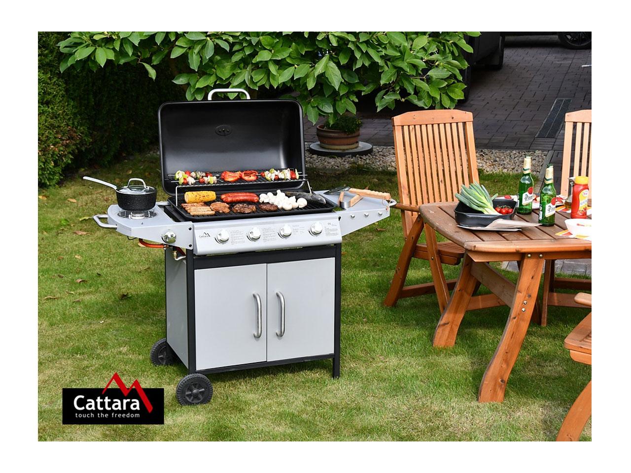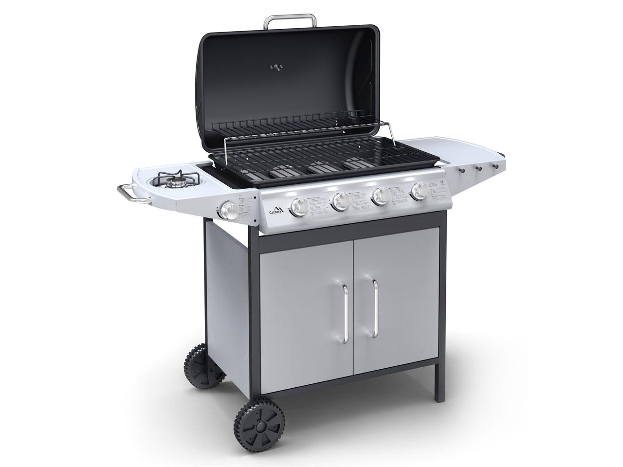 Gril je pojízdný (2 kolečka), je vybaven sklopným víkem s teploměrem a odkládacími poličkami s háky na příslušenství. Dále je vybaven přídavným bočním vařičem se samostatnou regulací a piezo zapalováním. Ve střední části je uzavíratelná skříňka s dvířky. Součástí je i spojovací hadice k plynové lahvi a redukční ventil. Díky sklopné boční poličce se gril snadno skladuje.