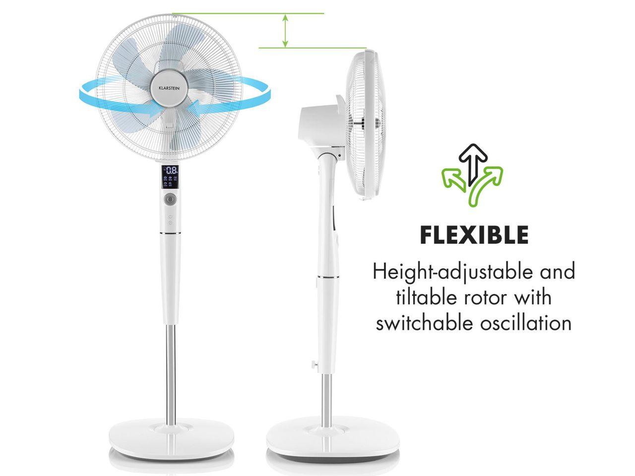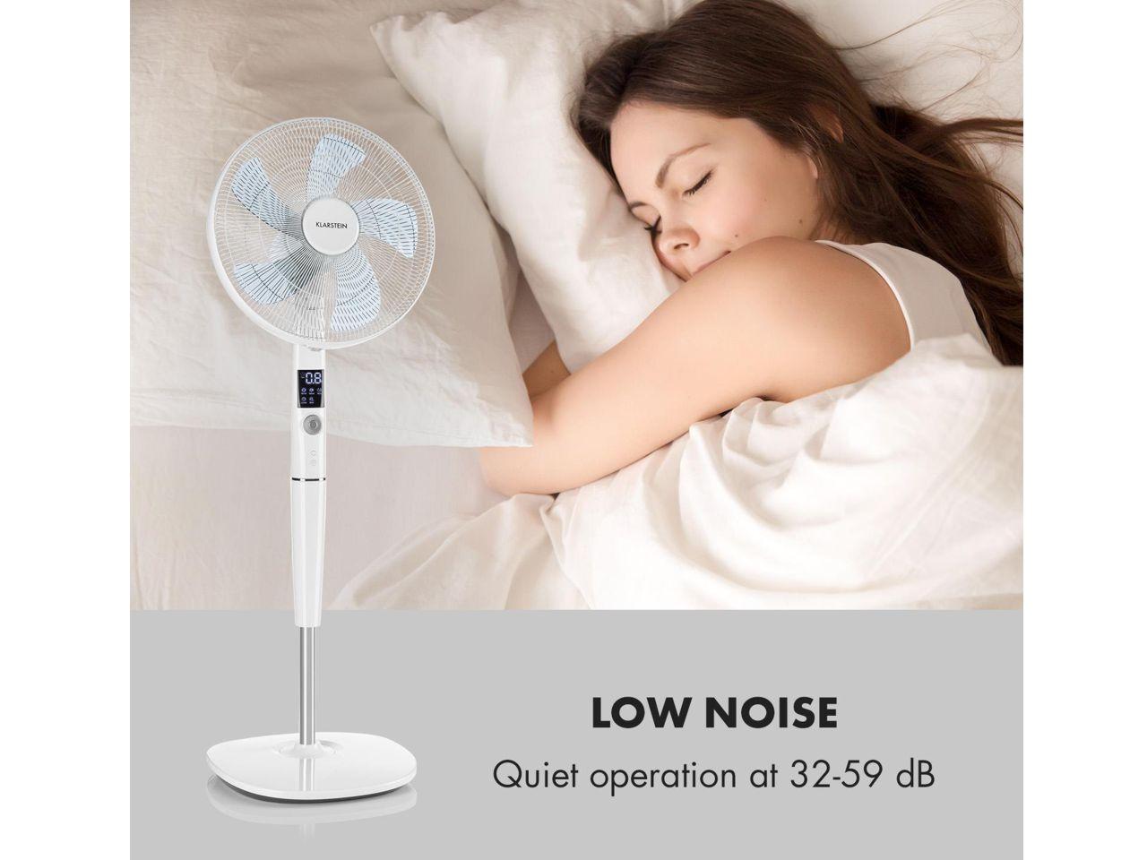 Tichý stojanový ventilátor KLARSTEIN Silent Storm s 16 "(41 cm) 5listou vrtulí na tvorbu osvěžujícího vánku během letních dní - pro místnosti s objemem až do 80 m³. Mimořádně úsporný příkon 35 W. Celý popis