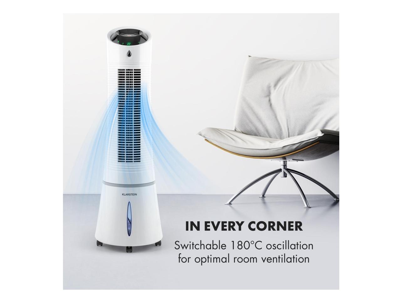 Ventilátor vane čerstvý vzduch, který zajistí chlazení ve třech rychlostech. Přepínatelná oscilace umožňuje rotovat horní dvě třetiny zařízení Klarstein Skyscraper v 180° zleva doprava a zpět. Tím se optimálně rozproudí i vzduch ve větších prostorách. Pro splnění všech Vašich požadavků může být ventilátor přestaven z normálního provozu na noční a přírodní režim. Během nočního režimu se ventilátor v 30 minutovém rytmu přepne na nejbližší nižší rychlost a nakonec se vypne, přírodní režim přidává a ubírá rychlost ventilátoru, což napodobuje přirozený vítr.