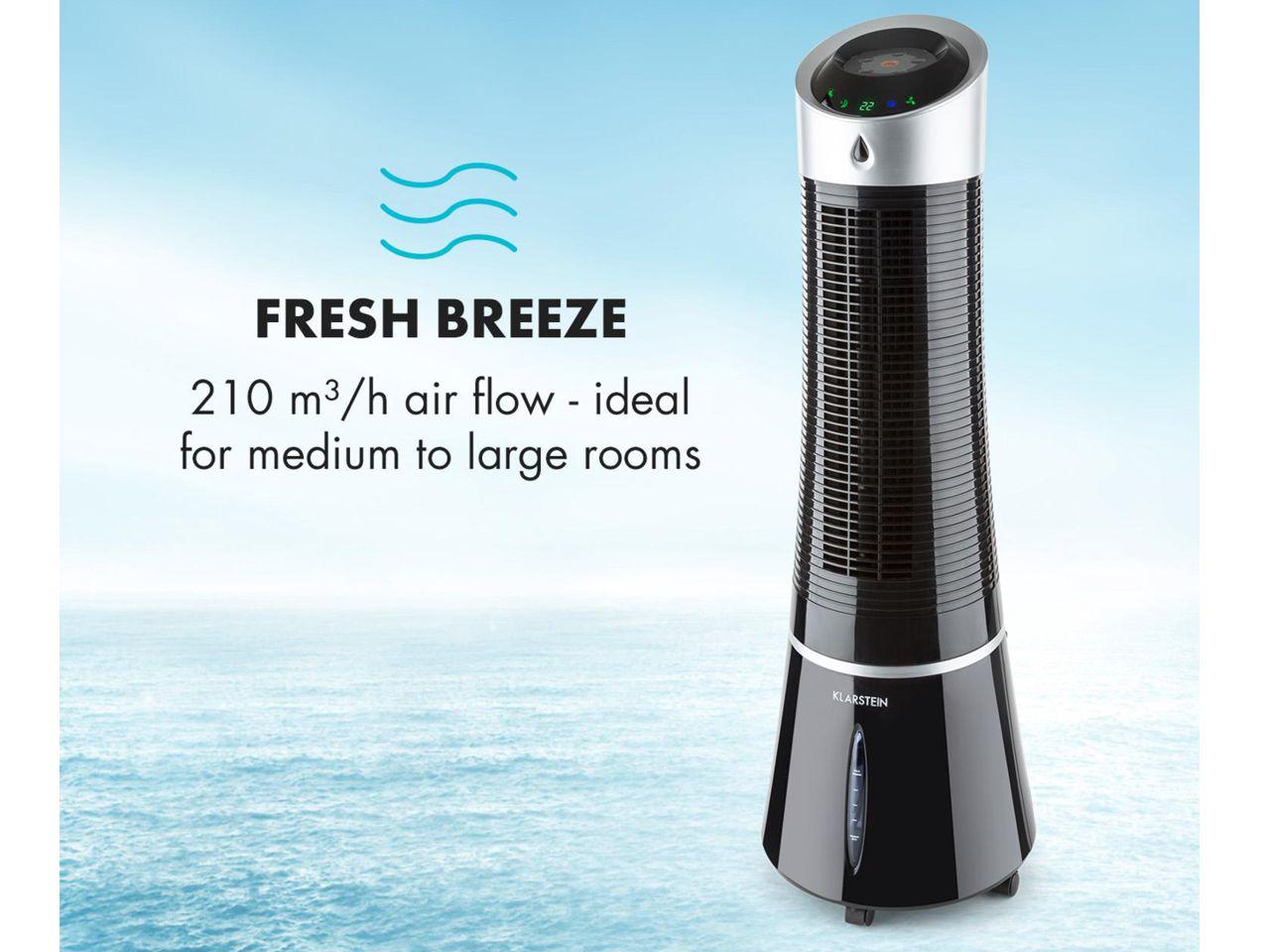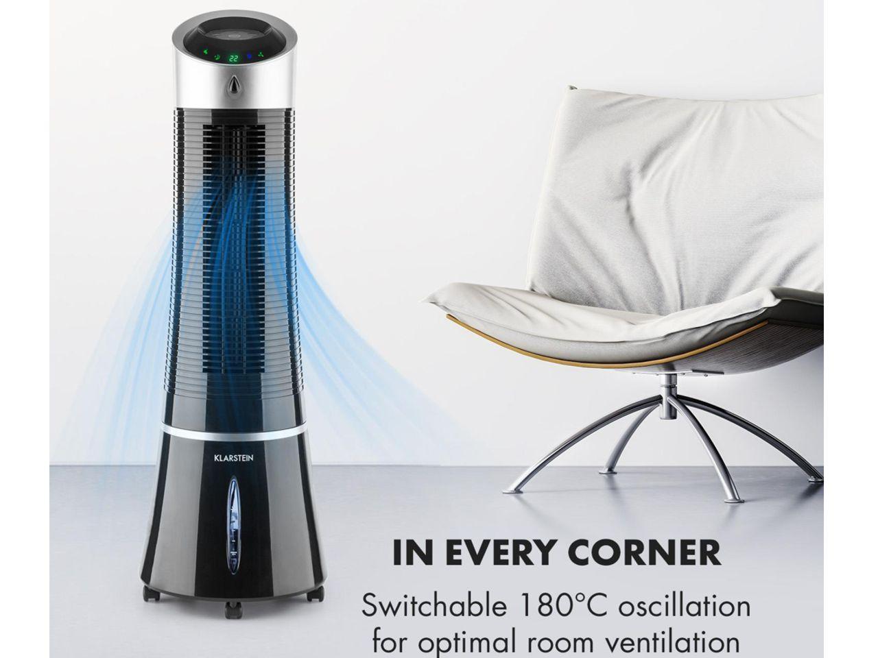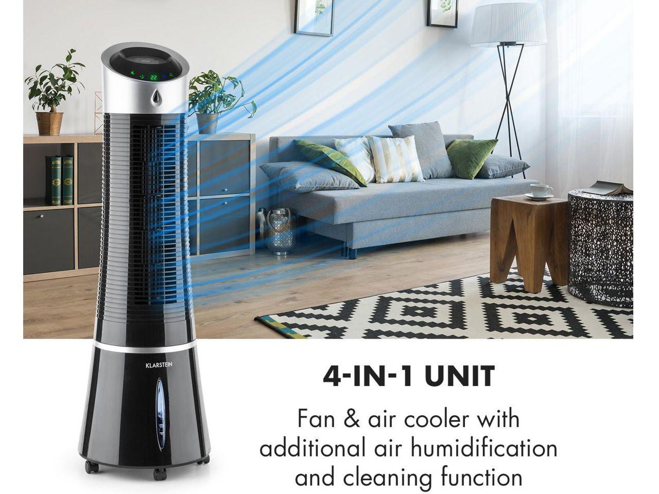 4 v 1 Skyscraper Ice od společnosti Klarstein vizuálně i výkonnostně převýší své kolegy a přináší do Vašich pokojů čerstvý vzduch. Osvěžující netradiční konstrukce je inspirována zářivě černým mrakodrapem a již svým tvarem a barvou podpoří touhu po chladném, čerstvém vzduchu a jemném vánku. Prostorově úsporná věž ukrývá hned funkce tří zařízení, šikovně sjednocuje ventilátor, chladič a zvlhčovač vzduchu. Ve svém nejširším místě měří stojící ventilátor jen 28 cm a hodí se tedy i do malých prostor. Celý popis