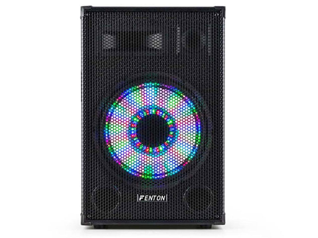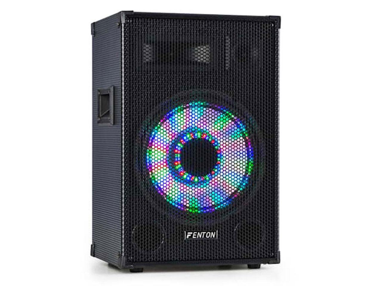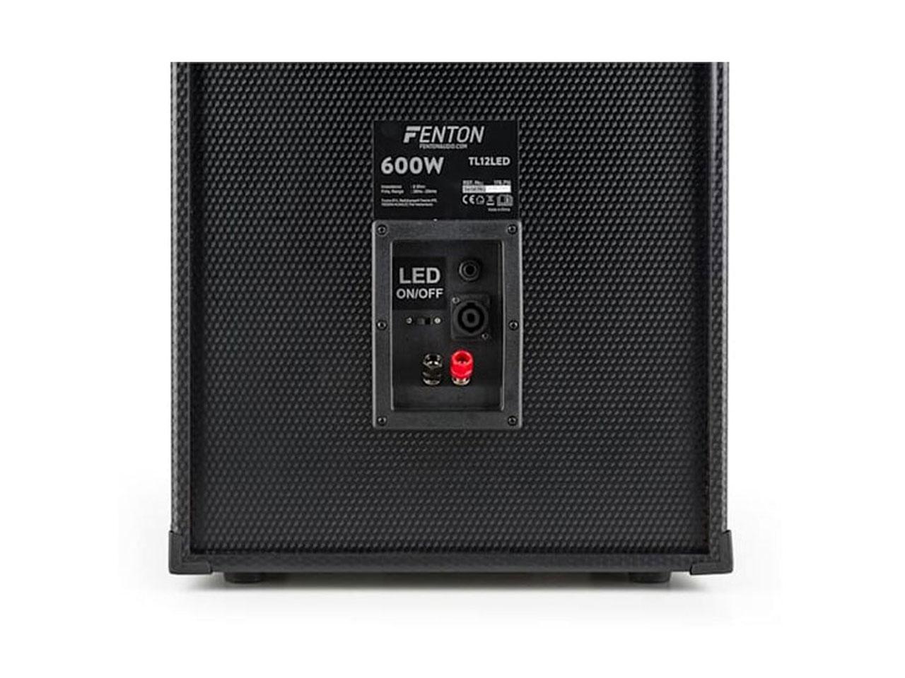 3cestný reproduktor Fenton TL12LED nabízí 12 "basově-středovým reproduktorem silný výstupní výkon 600 W, čisté výšky díky dvěma piezo-tweeterům. Mimořádnou atmosféru vytváří UFO světelný efekt na woofer ovládaný hudbou. Lehká, ale robustní konstrukce v karbonové optice s ochranami na rozích se mimořádně hodí pro přenášení. Kovové mřížky chrání reproduktory před nárazy. Pro montáž na stativ je k dispozici normovaná příruba s průměrem 35 mm.