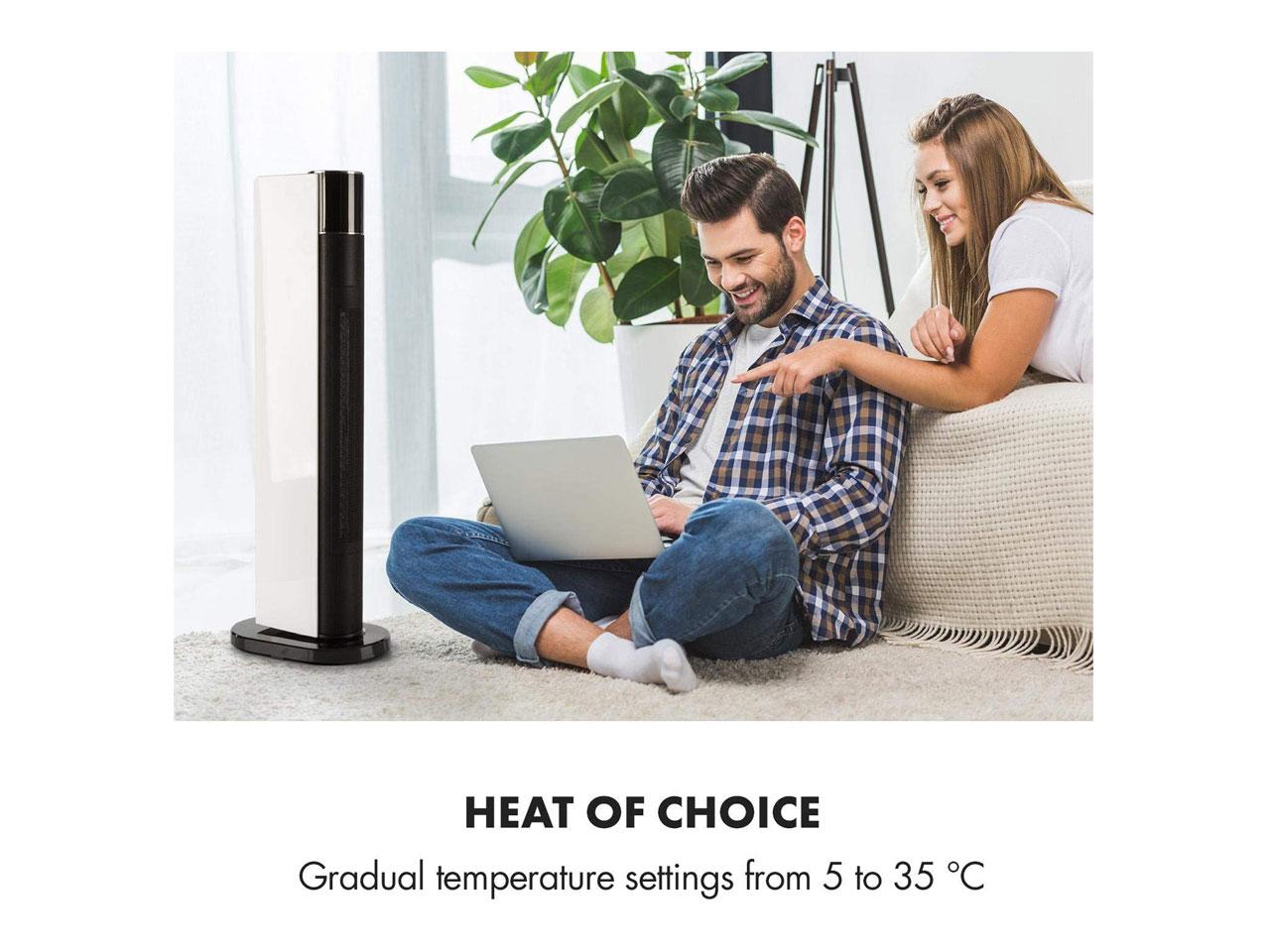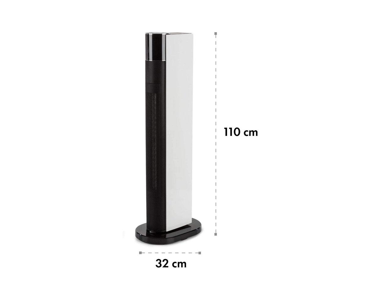 Zařízení Hightower Heat Deluxe však zaujme i opticky. Keramické topné těleso se ukrývá v štíhlé věžovitého konstrukci, která se se svým bílo-černým jednoduchým designem se stříbrnými prvky bez problémů začlení do každého stylu zařízení obytného prostředí. Kulatý stojan sloupového teplovzdušného ventilátoru Klarstein s průměrem 22 cm poskytuje vysokou stabilitu a nevyžaduje mnoho místa.