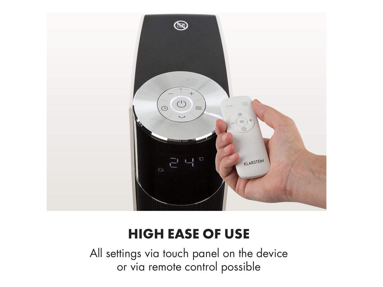 2-v-1 je heslem modelu Klarstein Hightower Heat Deluxe, který se chápe jako ohřívač a ventilátor v jednom, díky čemuž poslouží během celého roku. Bleskurychlé ohřívá vzduch, teplo cítit už chvíli po zapnutí. Díky třem úrovním ohřívání s výkonem až do 2200 W jednoduše zahřeje místnosti až do 20 m². Funkce zapínatelná oscilace rozděluje teplý vzduch v místnosti, čímž se urychluje proces vytápění. Požadované cílové teplo je možné zvolit v rozmezí 5 až 35 ° C. Po dosažení této teploty se teplovzdušný ohřívač automaticky vypne. Okamžitě však obnoví provoz, když teplota klesne pod požadované hodnoty - šetří se tím proud a přesto je místnost udržována komfortně teplá. 24hodinový časovač se naprogramuje v krocích po hodinách a po uplynutí nastavené doby zařízení zapne nebo vypne. Všechny funkce se ovládají prostřednictvím přehledného dotykového panelu nebo pohodlně pomocí dálkového ovladače. Zařízení Hightower Heat Deluxe pracuje i zcela bez topného výkonu a využívá své dvě rychlosti ventilátoru i funkci otáčení, aby v místnosti distribuoval příjemný, chladný vánek. Díky principu nízkého hluku vytváří zařízení pouze 39 dB pracovního hluku, a proto se dá skvěle využít i v ložnici. Všechna nastavení lze provést buď přímo na dotykovém panelu teplovzdušného ohřívače nebo pomocí dodávaného dálkového ovladače. Nastavení jsou vždy viditelné na LED displeji.