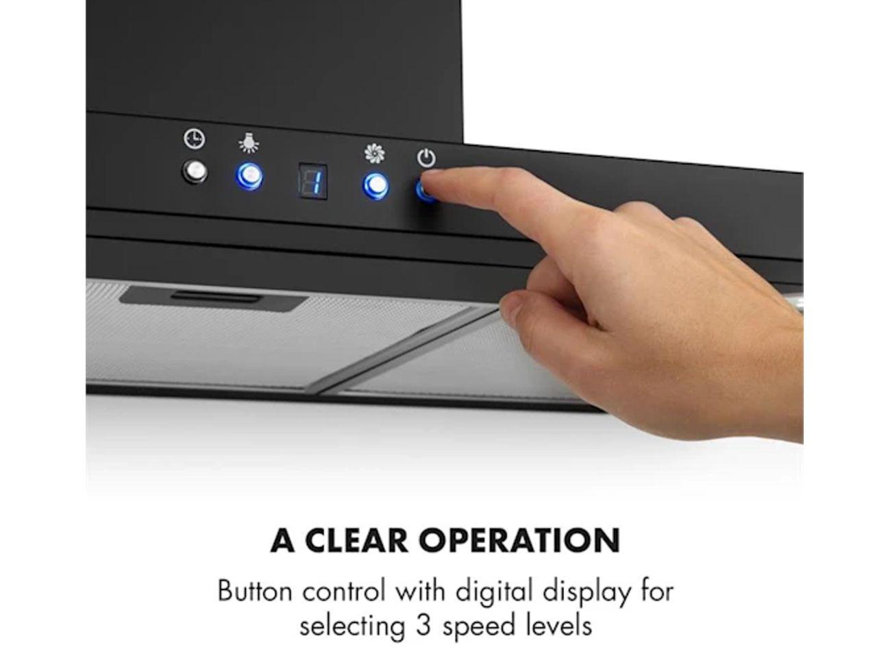 Šířka digestoře Klarstein Limelight 90 cm ideální pro středně velké až velké varné plochy kuchyňské linky. Na nejvyšším výkonnostním stupni vymění z kuchyně až do 620 metrů krychlových vzduchu a poradí si i s přípravou několika chodů. Díky moderní technice se vyznačuje redukovanou spotřebou proudu, což šetří peněženku i životní prostředí. Jednoduchá ovládací sekce na předním panelu digestoře umožňuje nastavení jedné ze 3 ventilačních úrovní. Časovač nabízí automatické vypnutí v určeném čase po dovaření. Dvě zabudovaná světla účinně osvětlují varnou plochu, takže zanícení kuchaři přesně vidí, co právě dělají.