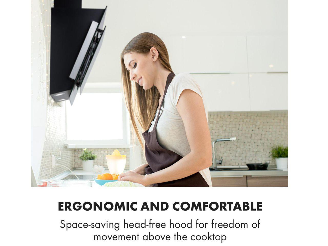 ergonomický a komfortní: prostorově úsporná digestoř, která nabízí volnost pohybu za sporákem a nepřekáží Vaší hlavě