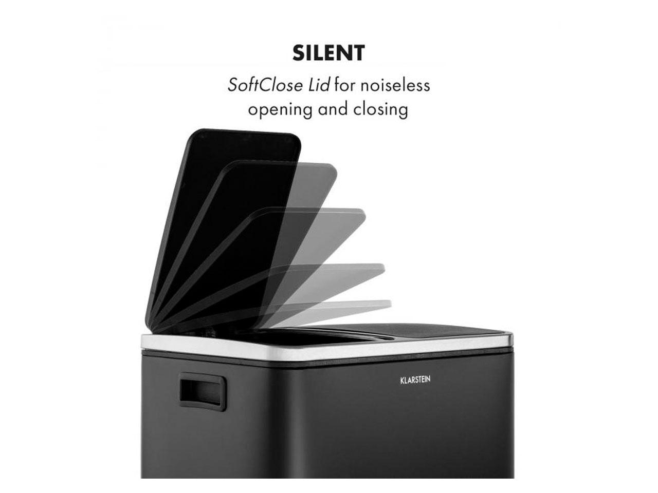 Odpadkový koš Klarstein Trash Gordon ve svém objemném interiéru nabízí nejen jednu, ale hned dvě nádoby na třídění odpadu, čímž zpříjemňuje separování. V koši na tříděný odpad o objemu 30 litrů se skrývají dvě 15litrové, samostatně vyjímatelné nádoby z nerozbitného PP plastu a čekají na naplnění odpadem. Pomocí šlápnutí na pedál se vysune kryt jednotlivých nádob nahoru a otevře se. Pokud je koš v nádobě na odpad, klapky se znovu potichu zavřou. Když se nádoba naplní a třeba ji vyprázdnit, každá nádoba se dá jednotlivě odebrat z pochromovaného kovového držáku. Vnější nádoba z ušlechtilé oceli s černým práškovým lakováním se postará o jednotný a elegantní vzhled.