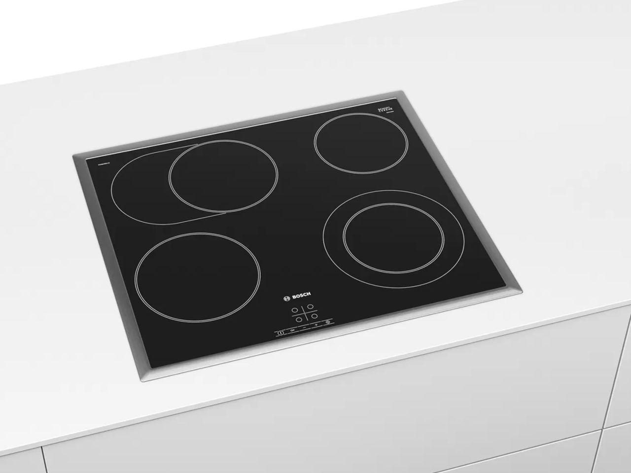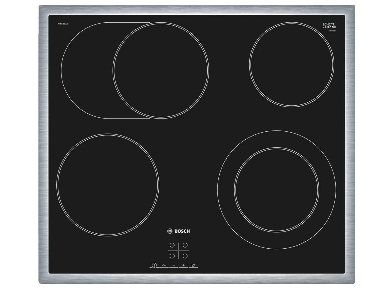 Sklokeramická varná deska Bosch PKN645BA1E v černém provedení s nerezovým rámem má jednoduché TouchSelect ovládání varných zón. Nabízí 4 HighSpeed zóny, z toho 1 dvoukruhová a 1 s rozšířením na zónu k pečení. Varná deska Bosch PKN645BA1E je vybavena 2stupňovým ukazatelem zbytkového tepla pro každou varnou zónu, dětskou pojistkou, bezpečnostním vypínáním a hlavním vypínačem. Celý popis