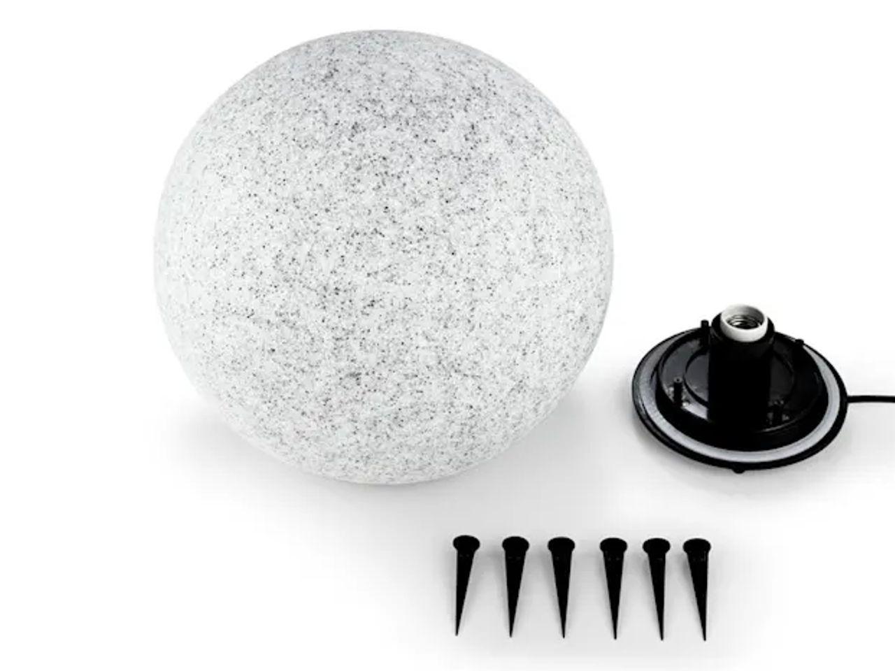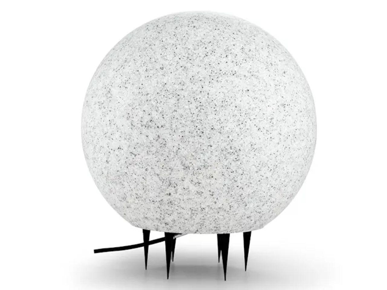 Ačkoliv lampa vypadá jako z kamene, je velmi lehká. Stačí ji připevnit na kolíkový stojan a ten upevnit do země. Umělohmotná koule je odolná vůči vodě a větru, čili ji při bouřce není třeba ji schovávat dovnitř.