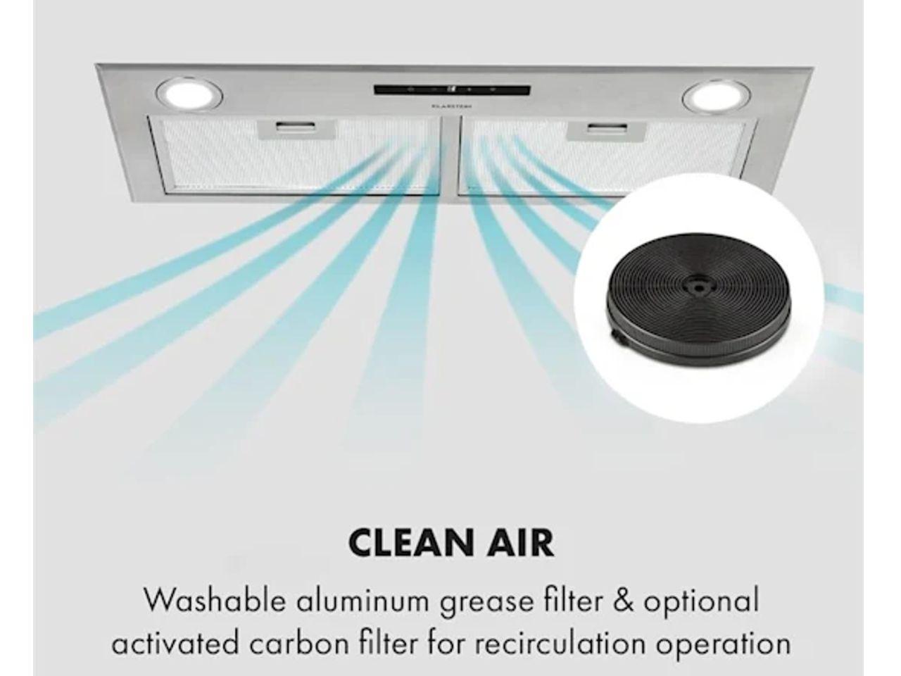 Čistý vzduch: omyvatelný hliníkový tukový filtr & volitelný filtr s aktivním uhlím pro recirkulační provoz