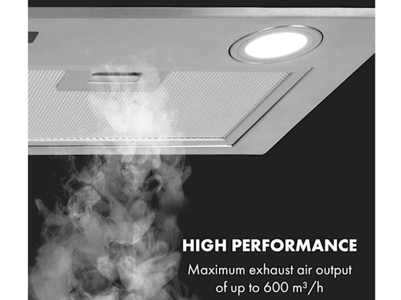 Nenápadná, ale výkonná: Navzdory svému silnému výkonu je vestavěná digestoř Klarstein Paolo téměř neviditelná, aby nic nerušilo dojem Vaší kuchyňské linky.
