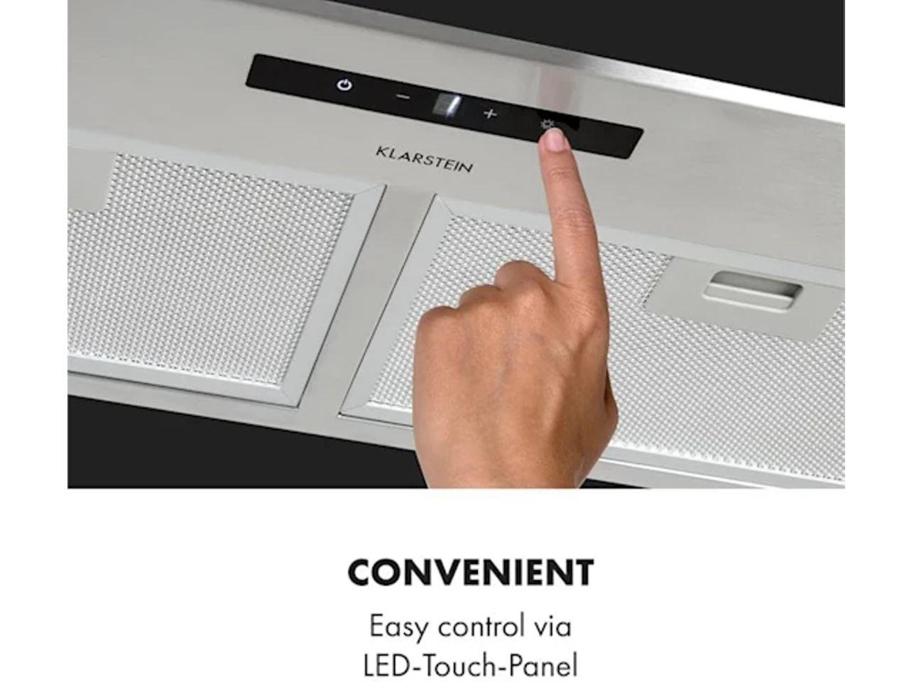Digestoř Klarstein Paolo se postará s výkonem 200 W v režimu odsávání vzduchu o čistý vzduch v malých až velkých kuchyních. Tři úrovně výkonu umožňují odsávání až 600 m³ vzduchu za hodinu a cíleně přizpůsobují zabudovaný kryt digestoře výparům z vaření. Speciálním prvkem našeho jen 72,5 cm širokého a 29,1 cm hlubokého zařízení Paolo je jeho schopnost nenápadně se začlenit do kuchyňské linky. Na rozdíl od většiny vestavěných digestoří se bez okrajů ztratí mezi kuchyňskými skříňkami nad sporákem a projevuje se jen svou černou spodní stranou z ušlechtilé oceli. Zde se zároveň skrývá nekomplikovaná dotyková ovládací sekce s větráním a ovládá se zde osvětlení. Funkce časovače vypnutí větrá vzduch ještě 1 až 9 minut a potom zařízení vypne. Zapínatelné světlo s 2 x 1,5 W LED světly efektivně osvětlí varnou plochu.