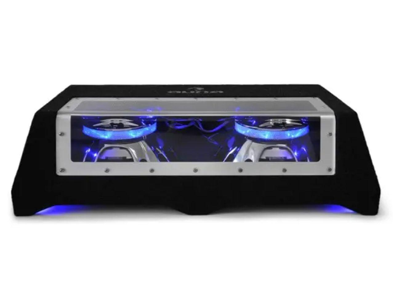 Mimořádná síla tohoto zařízení je v jeho vizuálním provedení, které vytváří viditelný vnitřní prostor subwooferů a volitelné modré LED světelné efekty připojitelné kabelem.