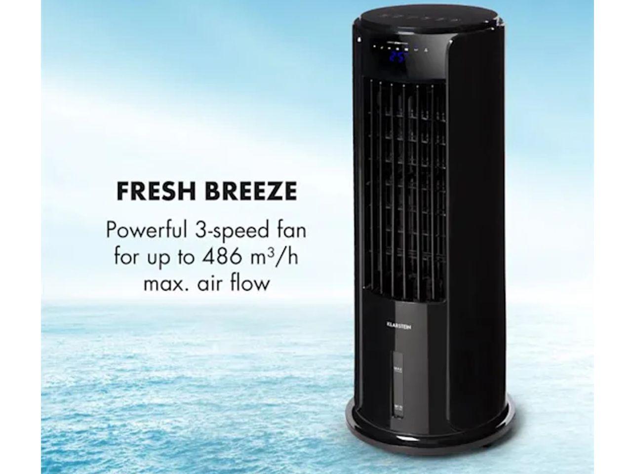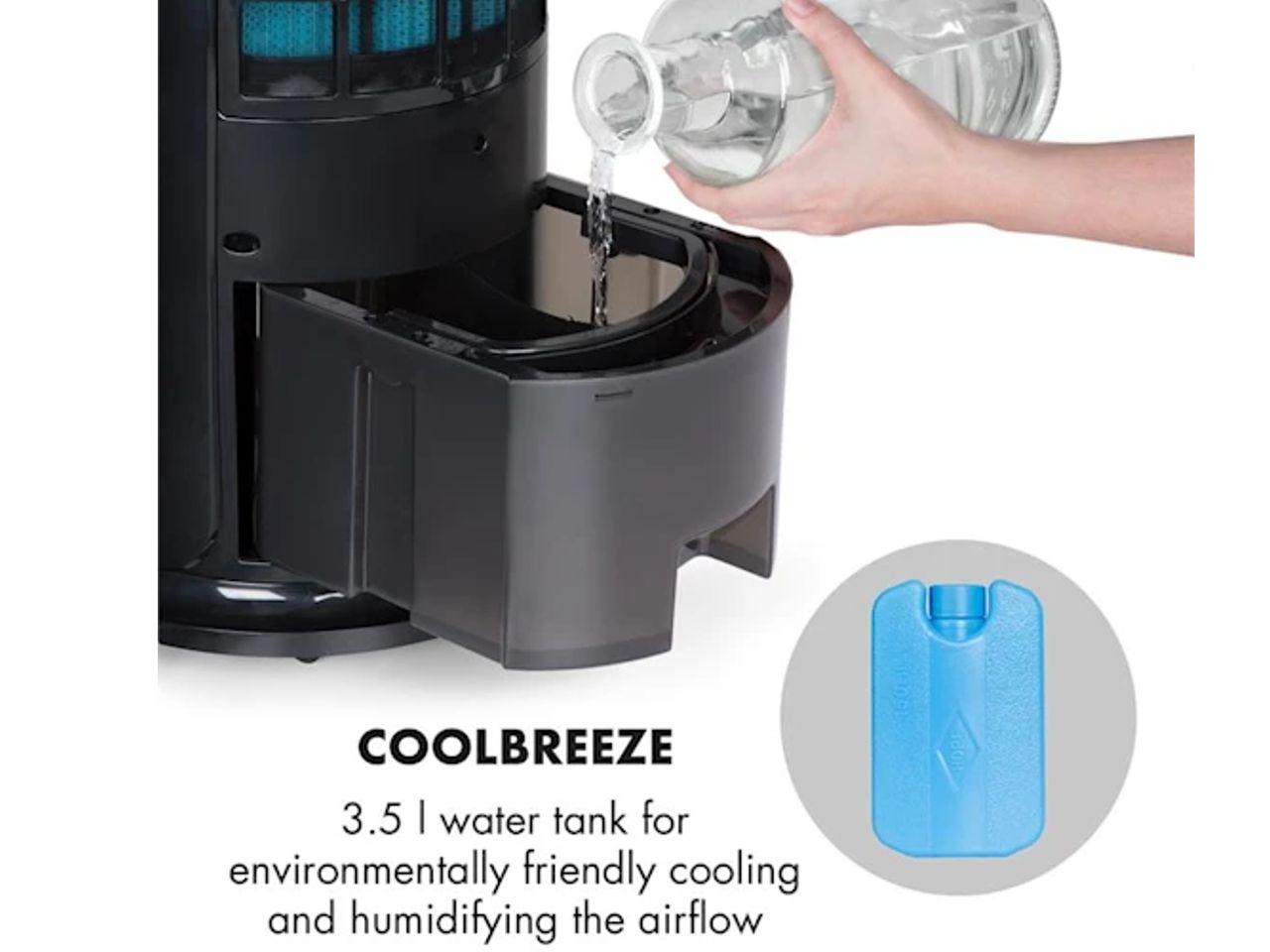 Přepínatelný chladič vzduchu zajišťuje chlazení vzduchu v kanceláři nebo v obývacím pokoji. Z jeho 3,5litrového zásobníku na vodu se odpařuje během hodin do proudu vzduchu chladná voda, čímž se nejen snižuje teplota v místnosti způsobem, který je šetrný k životnímu prostředí a hospodárný, ale také se současně zvyšuje vlhkost vzduchu pro uvolněné dýchání. Pokud je třeba doplnit vodu, stačí jednoduše vytáhnout nádrž. Přídavná chladicí sada může zvýšit chladicí výkon energeticky úsporným způsobem.
