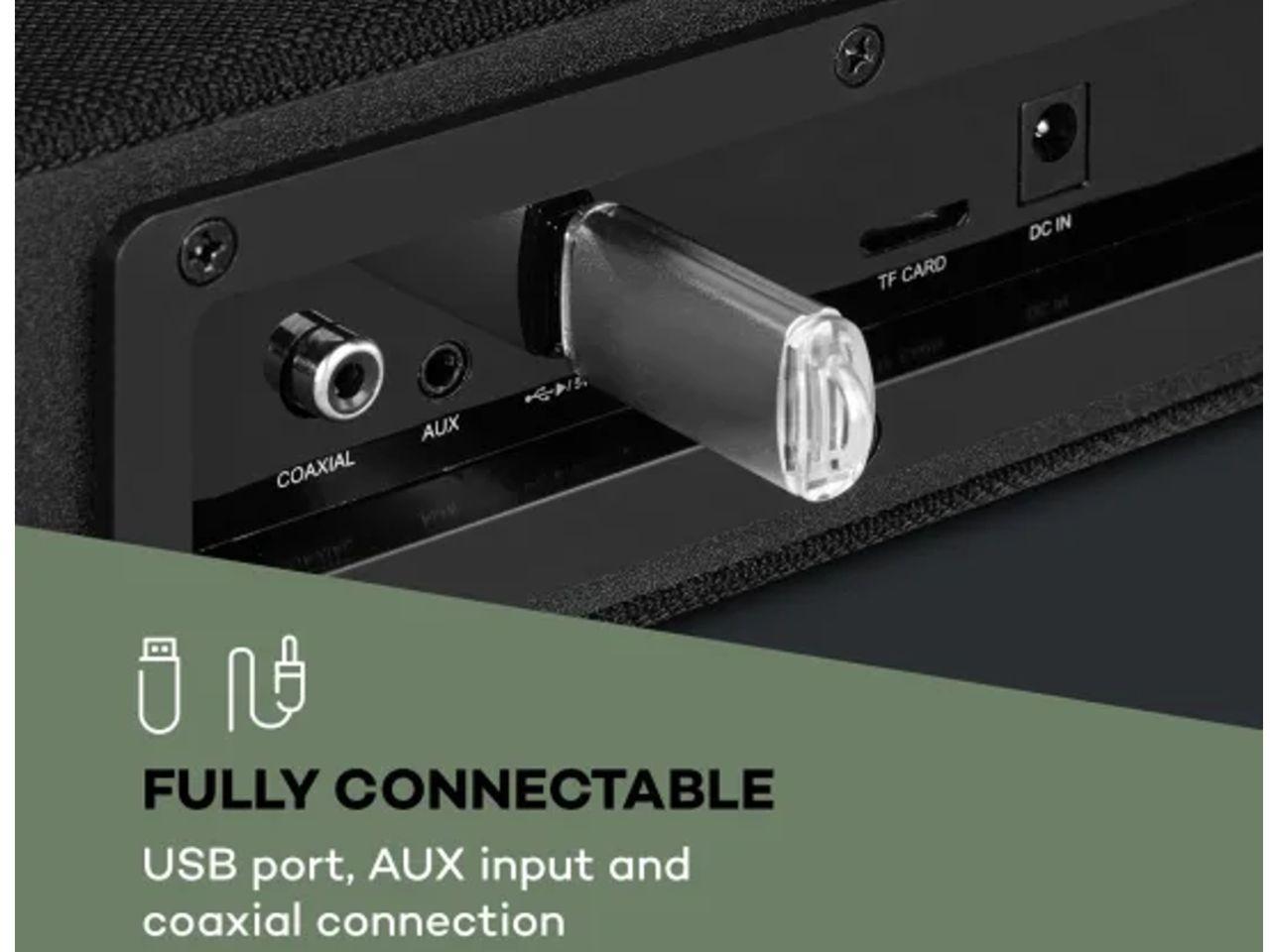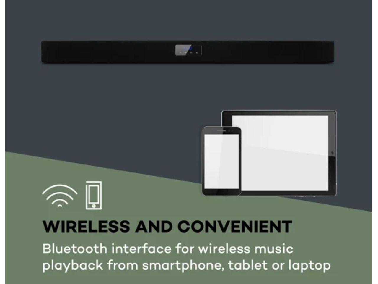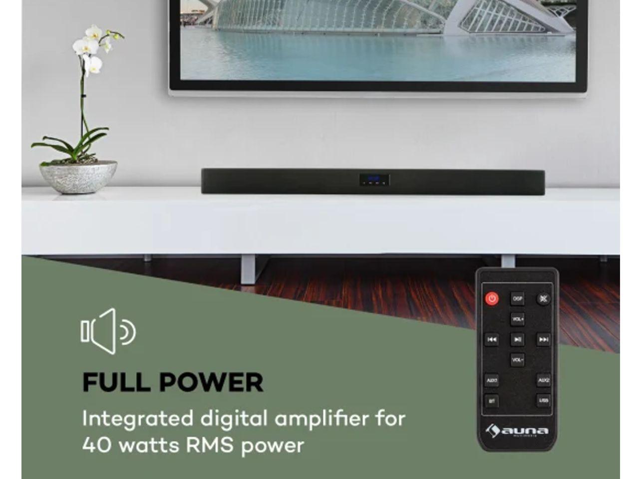 Srdcem zvukové lišty je zabudovaný digitální zesilovač, který je poháněn čtyřmi vestavěnými reproduktory, a tak vytváří výkon 80 W max. pro ozvučení i středně velkých obytných zón. Pro jemné zvukové doladění lze předvolit přednastavené DSP předvolby. Silný zvuk uchvátí publikum svou širokou dynamikou a vysokou srozumitelností řeči. I předpověď počasí bude křišťálově čistým zvukovým zážitkem.Pohled na zadní stranu odhaluje vysokou míru flexibility: Kromě rozhraní bluetooth pro bezdrátové přehrávání ze smartphonu, tabletu nebo laptopu má zařízení Areal Bar 150 i MP3 USB přehrávač s možností zásobování připojených zařízení proudem. Dva klasické 3,5mm jack vstupy připojují televizor, herní konzole, Blu-Ray a DVD přehrávače.Sound bary mají obrovskou výhodu a jsou zvláště efektivní tam, kde je k dispozici málo místa a kde je nežádoucí pokládání kabelů. Pro tento účel se buď nenápadně umístí pod televizor, nebo se upevní přímo na stěnu. Na zadní straně se nacházejí dva montážní body pro snadné zavěšení.Řízení zařízení Auna Areal Bar 150 probíhá buď přes dotykovou ovládací část, nebo zcela pohodlně pomocí dodávaného dálkového ovládání. Herní nebo filmový večer může začít – o správný zvuk je postaráno!