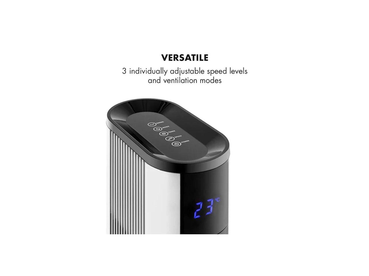 Ventilátor lze řídit na horním dotykovém panelu nebo celkem pohodlně dálkovým ovladačem. Podsvícený displej na zařízení informuje o stavu navoleného nastavení, a další displej v horní části zobrazuje aktuální teplotu v místnosti. Čtyři protiskluzové gumové nožičky zajišťují stabilitu, zadní rukojeť zase usnadňuje přemisťování ventilátoru.