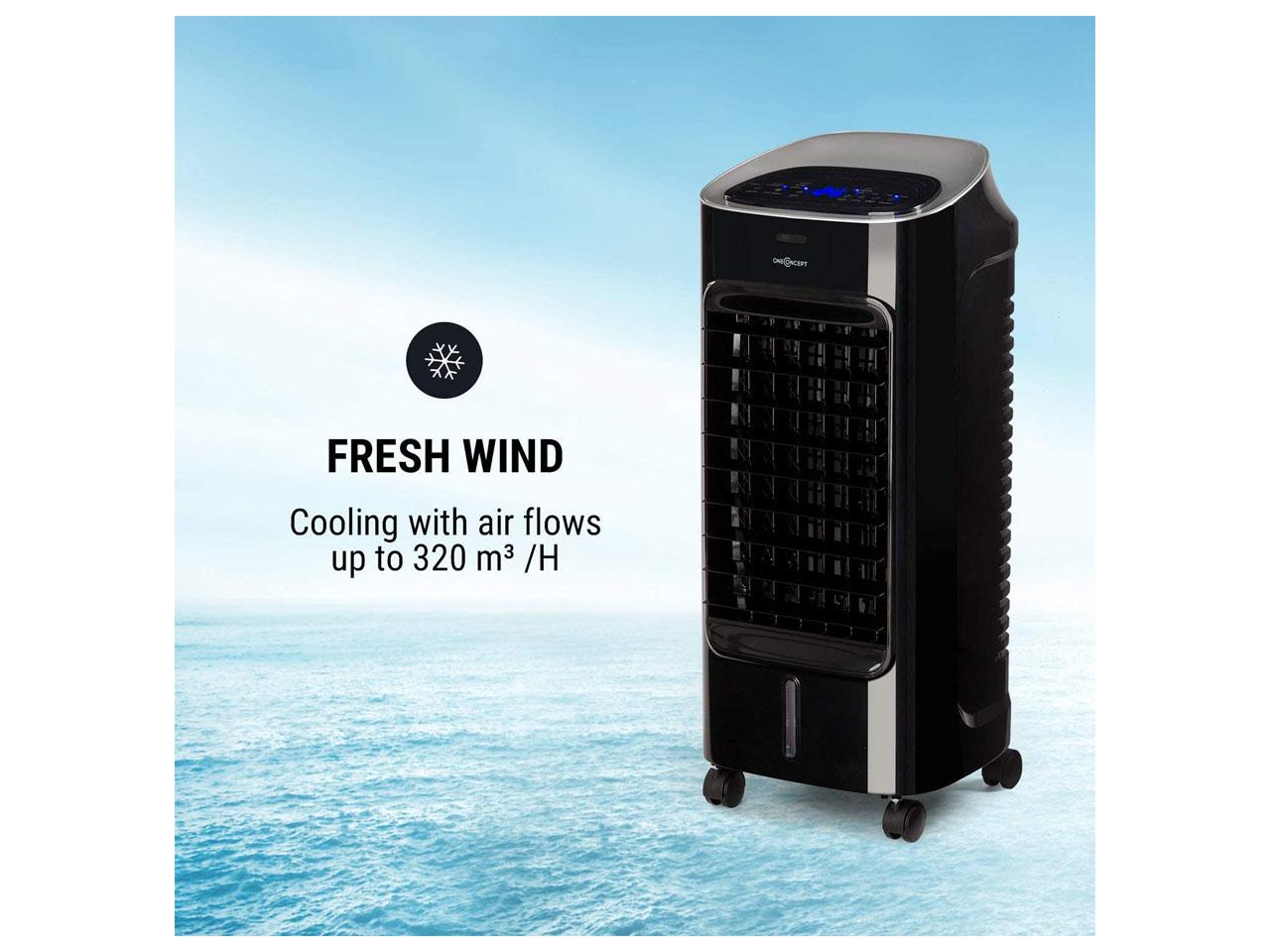 Přepínatelný chladič vzduchu zajišťuje chlazení vzduchu v kanceláři nebo v obývacím pokoji. Z jeho 4litrového zásobníku na vodu se odpařuje během hodin do proudu vzduchu chladná voda, čímž se nejen snižuje teplota v místnosti způsobem, který je šetrný k životnímu prostředí a hospodárný, ale také se současně zvyšuje vlhkost vzduchu pro uvolněné dýchání. Pokud je třeba doplnit vodu, stačí jednoduše vytáhnout nádrž. Dva přídavné chladiče mohou zvýšit chladicí výkon energeticky úsporným způsobem.