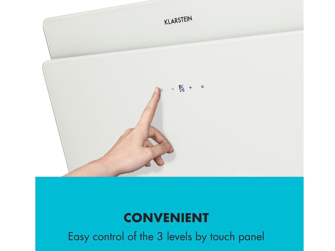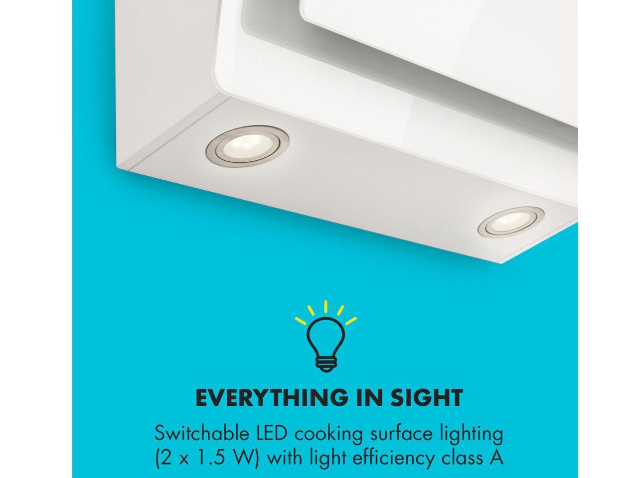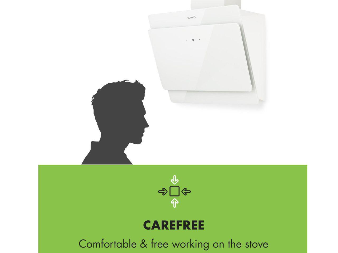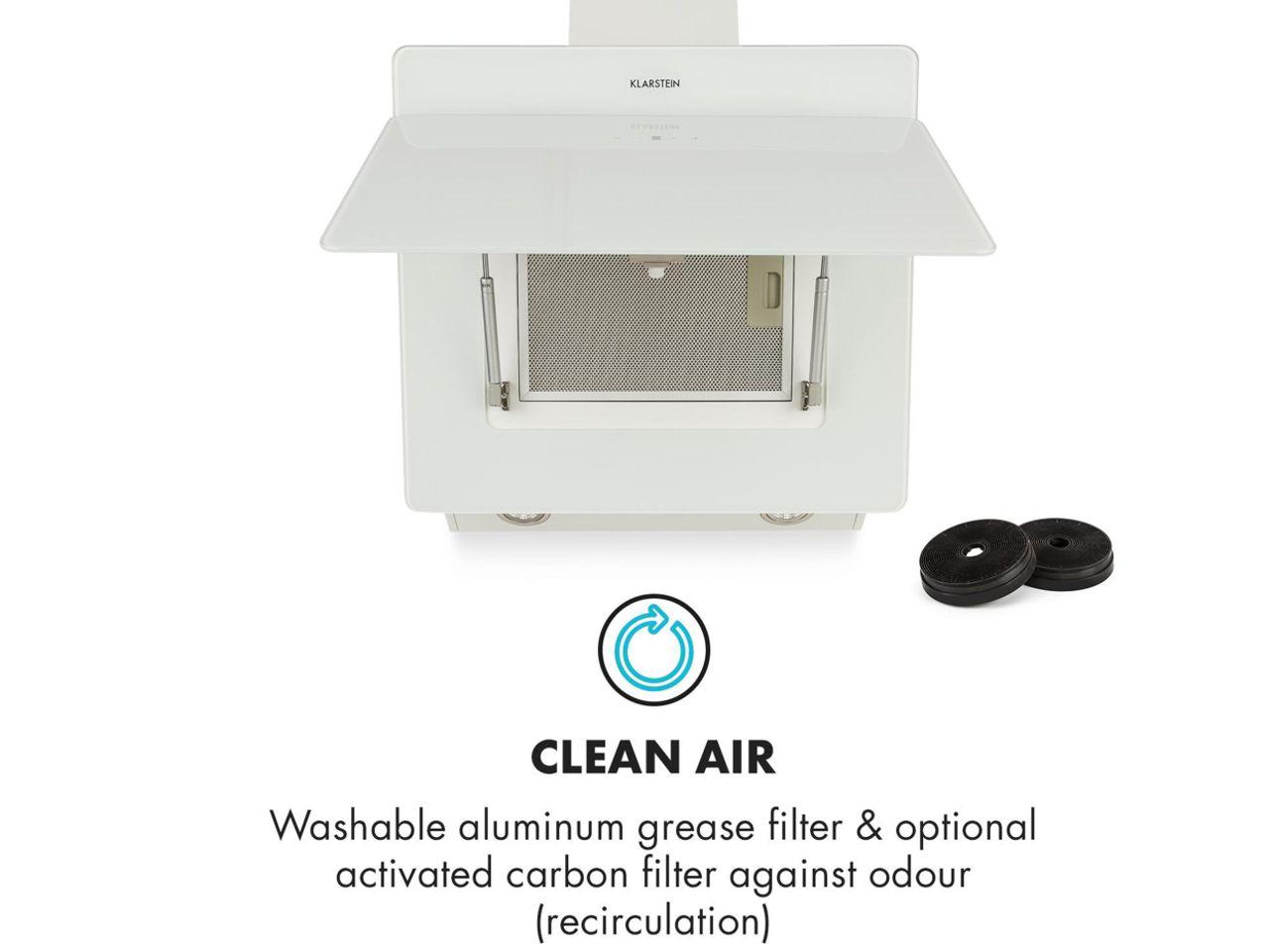 Nástěnný odsavač par Klarstein Aurica 60 přesvědčí nejen výkonnostními údaji, ale i svým luxusním vzezření: Bílá přední část se sklopným panelem z lesklého bezpečnostního skla dodává zařízení moderní vzhled, který je doplněn dvoudílný bílým obložením komína. Výkonný, skleněný luxus do kuchyně.