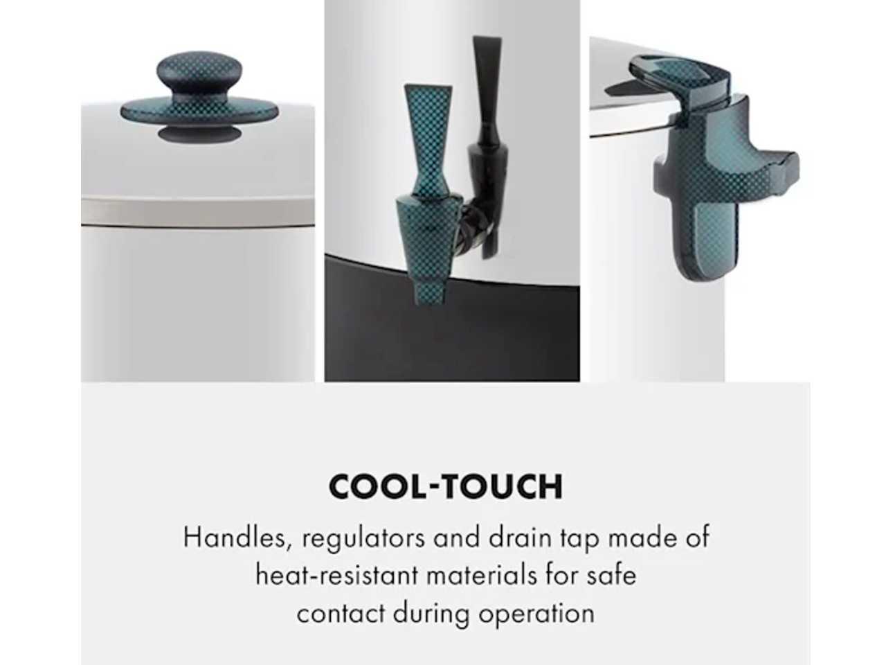 Cool-Touch: úchyty, ovladače a vypouštěcí kohout jsou z teplu odolných materiálů k bezpečnému styku během provozu