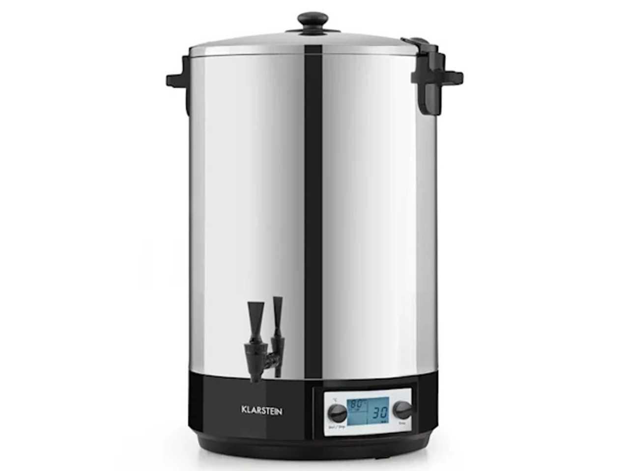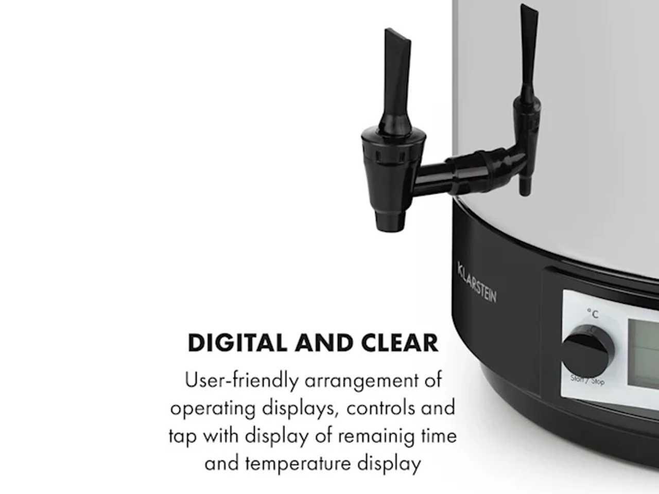 Ale tímto nejsou schopnosti Klarstein KonfiStar 50 digital ještě vyčerpány. Díky svému vkusnému a hygienickému interiéru z nerezové oceli, Cool-Touch výpustnému kohoutku a integrované funkci na udržování tepla se výborně hodí jako zásobník na nápoje na teplý čaj, punč nebo svařené víno, a tím obohacuje oslavy, bufety a konferenční místnosti.