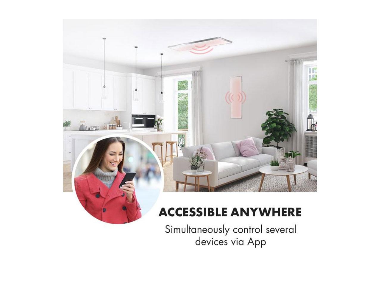 S termostatem a promyšlenými funkcemi, jako jsou WiFi a aplikace Klarstein App Experience, splní infračervený ohřívač i ty nejnáročnější požadavky. Aplikace, která se dá zdarma stáhnout, přeměňuje jakýkoliv smartphone na dálkový ovladač, který může ovládat neomezený počet zařízení díky funkci MultiCommand. Dokonce i mimo domov je možné pomocí aplikace ovládat a programovat ohřívače v síti. Nastavitelný týdenní časový spínač umožňuje programování časů topení na každý den týdnu. A protože zařízení Wonderwall pracuje bez ventilátoru, je ultra tichý díky technologii ZeroNoise Infrared a nevíří prach - což z dělá z tohoto ohřívače ideální volbu pro alergiky.