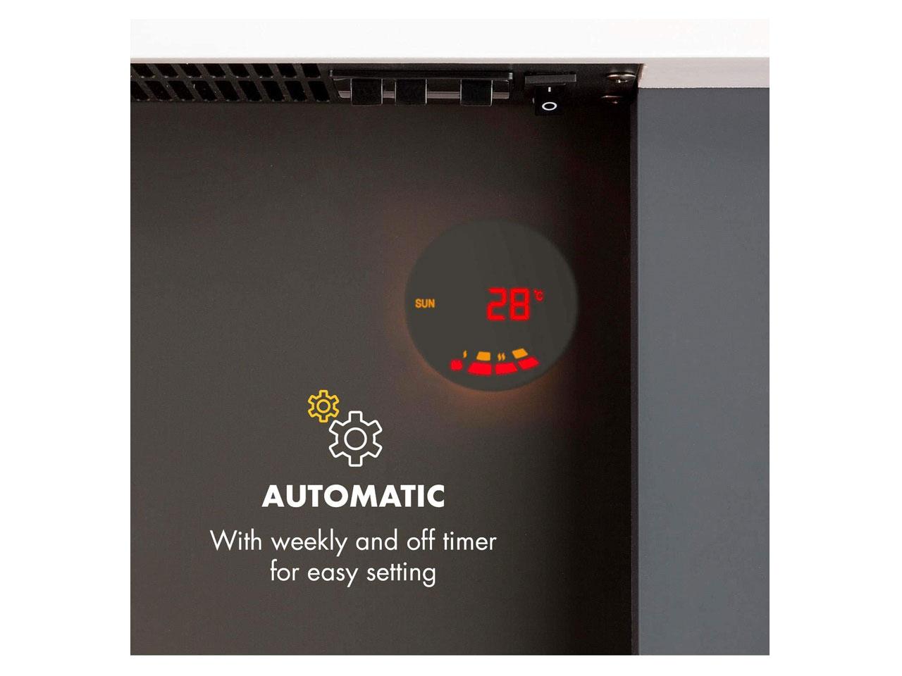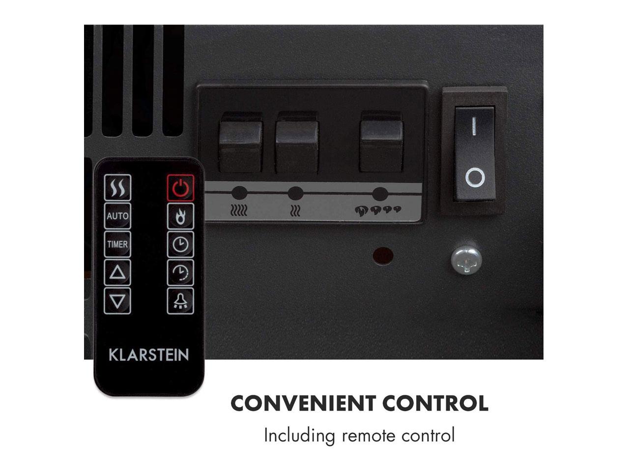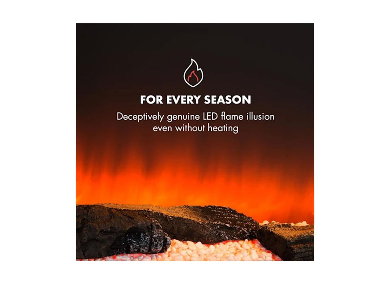 Úsporné LED plameny se mihotají zcela nezávisle na zapínatelné funkci vyhřívání. Vyhřívání nabízí dva výkonové stupně - 1000 W nebo 2000 W. Na stavitelný týdenní časovač slouží k přesné zapnutí/vypnutí světelné simulace a funkce vyhřívání. Přiložená sada polínek z keramiky dotváří realistický vzhled krbu.