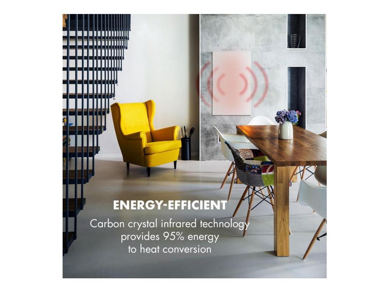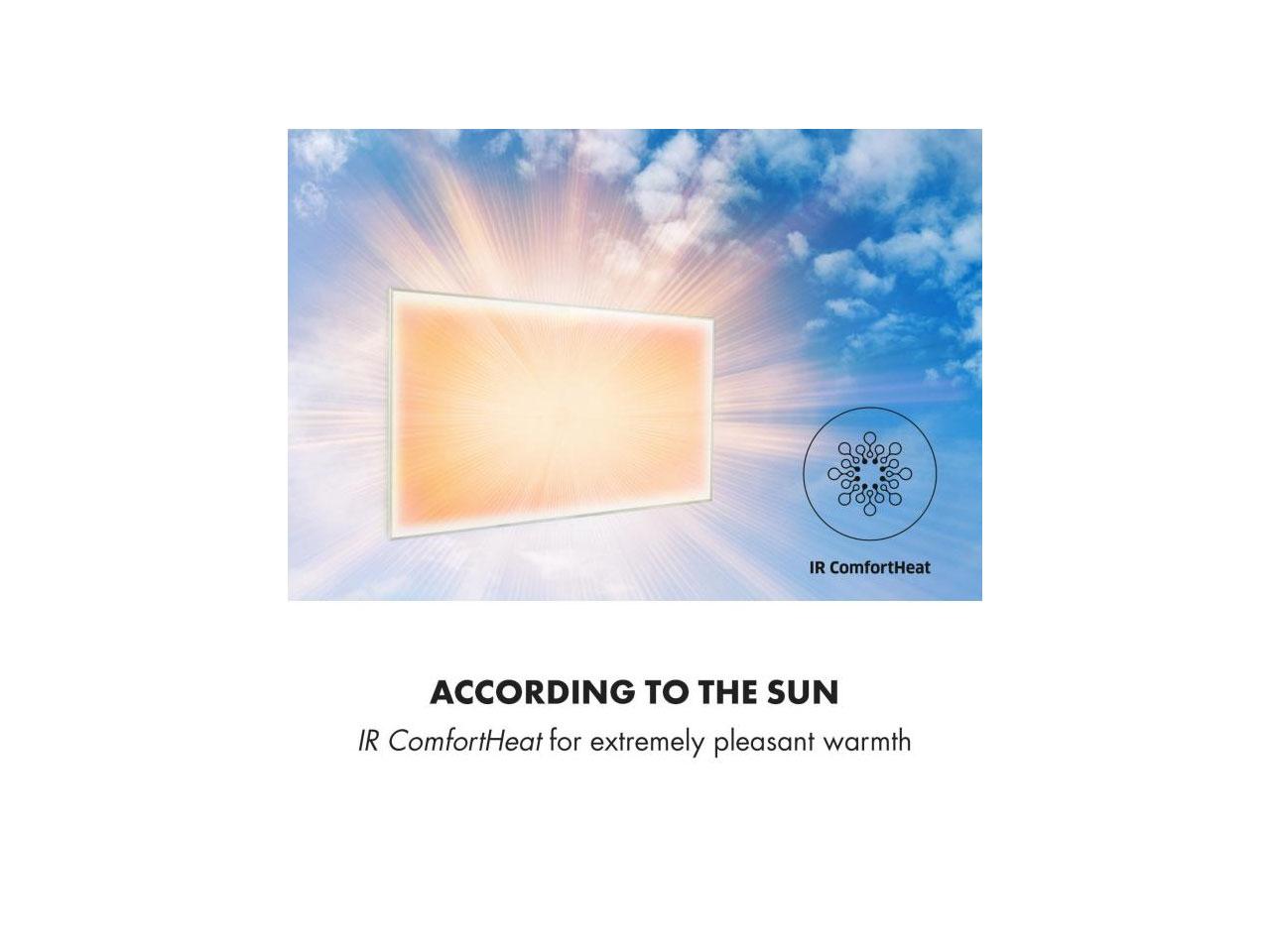 S výkonem 600 W šíří k lidské pokožce velmi příjemné infračervené teplo, které je vyzařováno cíleně na osoby v blízkosti ohřívače. Topný panel je zároveň velmi energeticky úsporný: Díky technologii IR Comfort Heat se přemění až 95% výkonu na tepelné vyzařování.