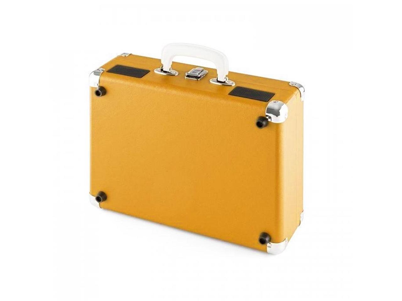 Kromě své technické rafinovanosti si Vás získá především šarmantním retro designem a přenosnou kufříkovou konstrukcí spolu s nastavitelným poutkem pro přenos a s rukojetí. Kompaktní šasi má červený design. Stabilní kovové panty a přední klipsový uzávěr drží konstrukci pevně.