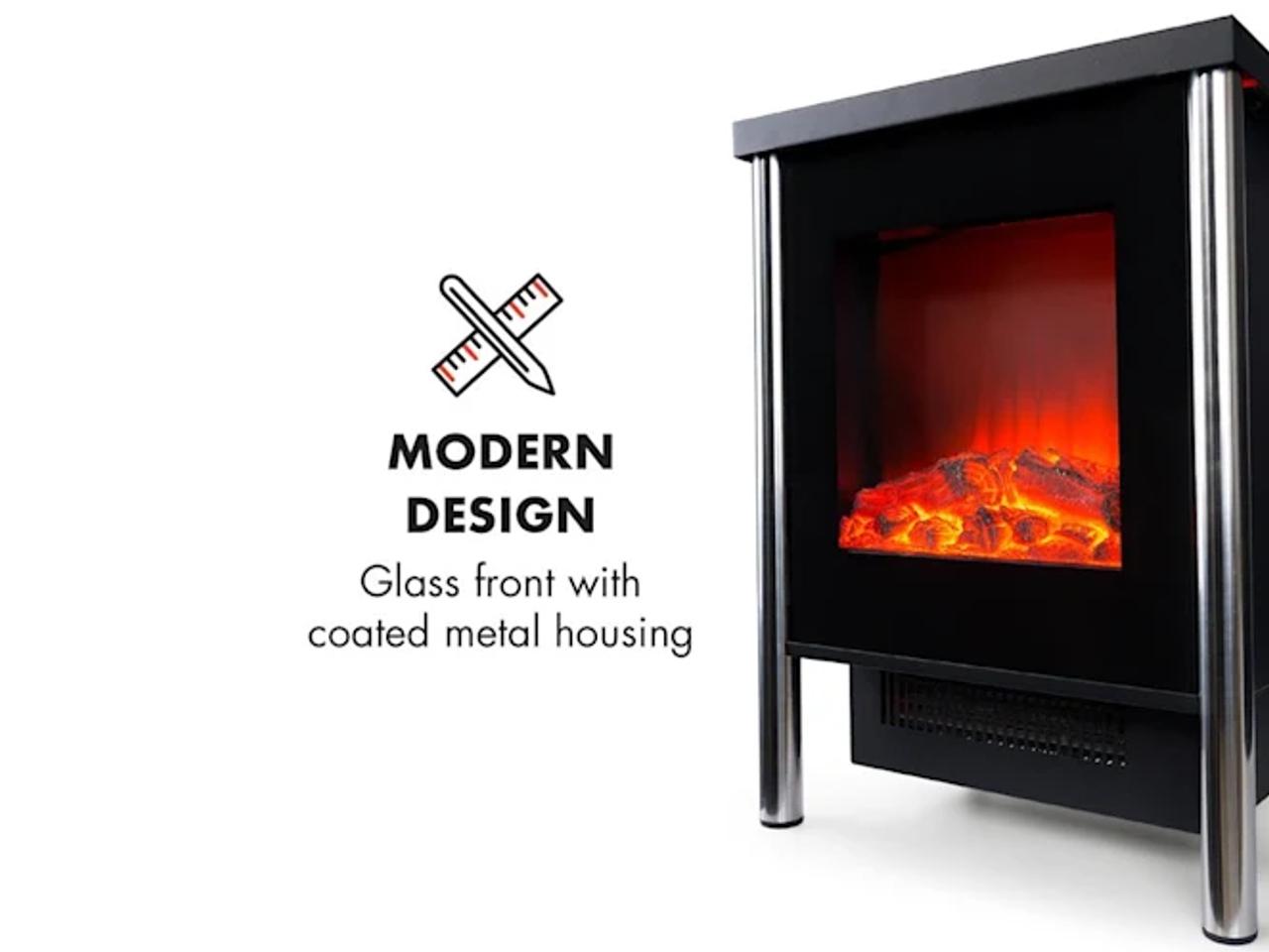 Mimořádností je bez pochyb jedinečný moderní design: přizpůsobí se každému bytovému zařízení a přesvědčí vysoce kvalitními materiálmi- sklem a kovem. Oba sloupy z ušlechtilé oceli dodatečně přispívají elegantnímu dojmu. Konstrukce je přitom tak kompaktní, že se elektrický krb vejde do každého pokoje.