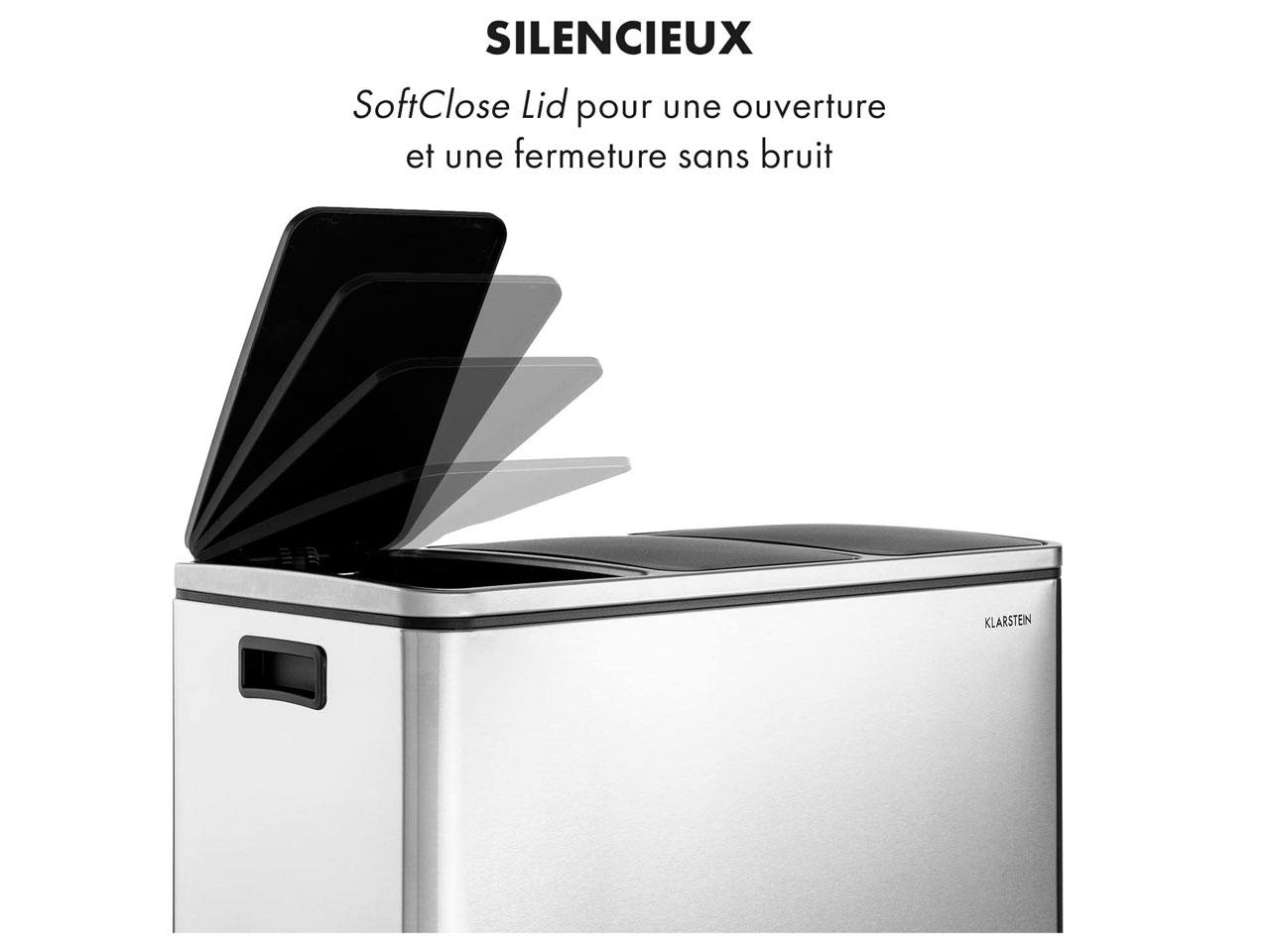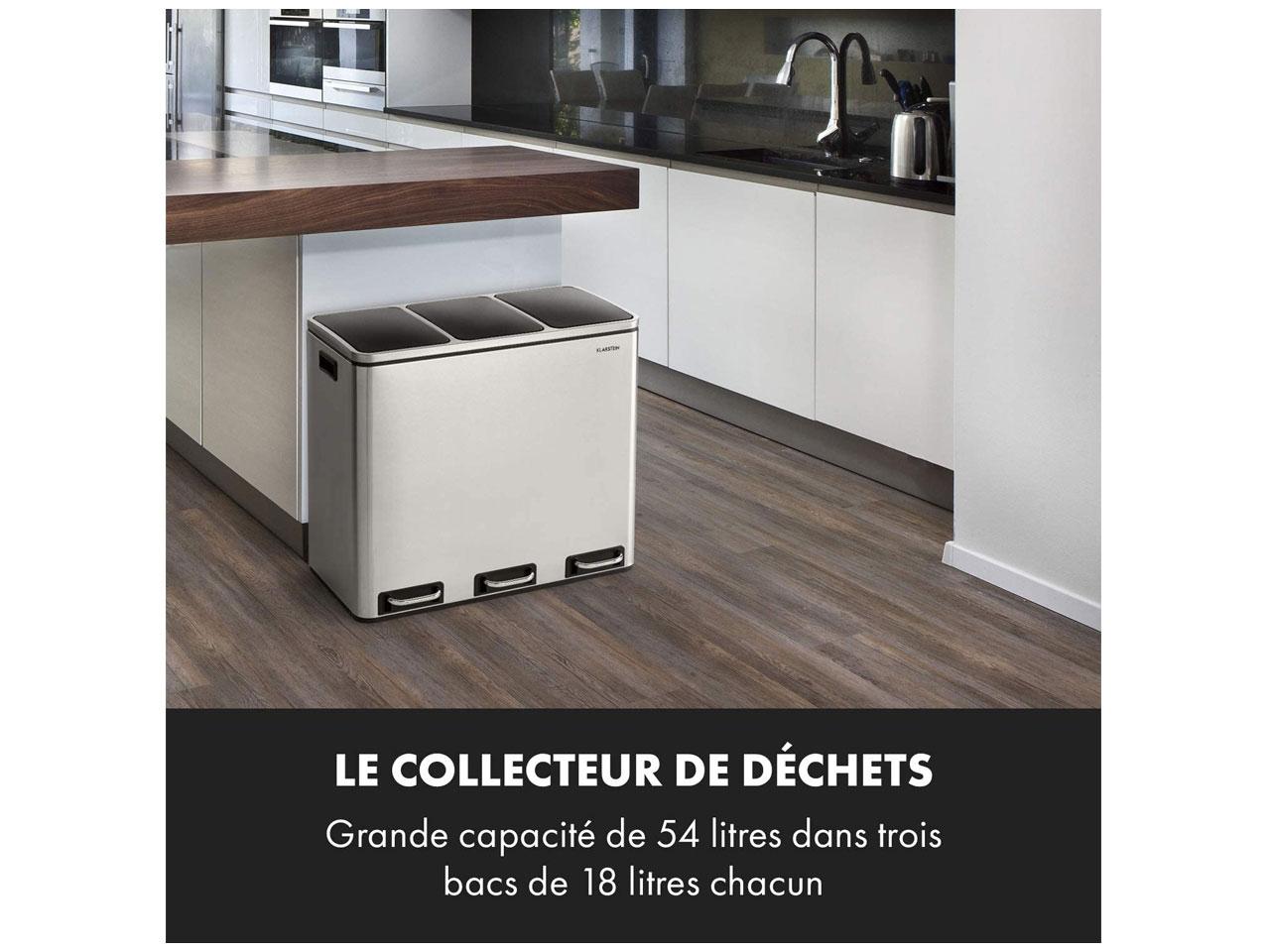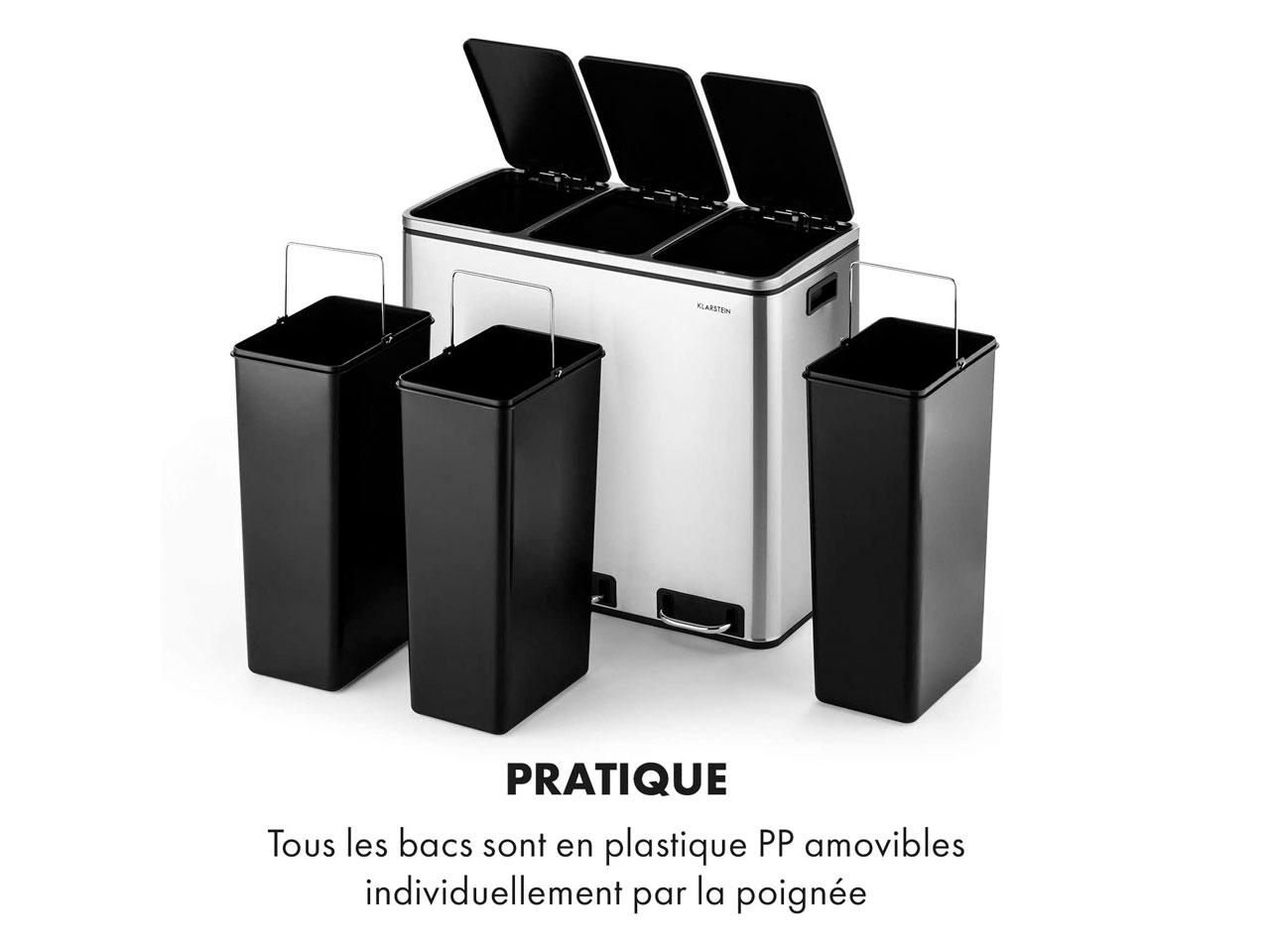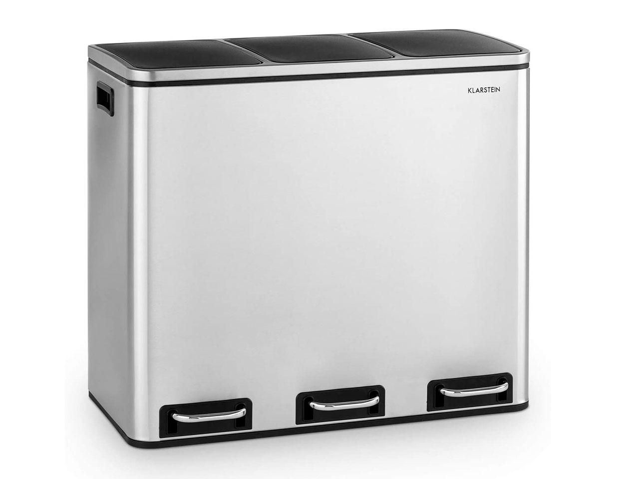 Proto nabízí odpadkový koš Klarstein Grandmaster ve svém objemném interiéru nejen jednu nádobu, ale hned tři nádoby na třídění odpadu, čímž zjednodušuje separování. V koši na tříděný odpad o objemu 54 litrů se skrývají tři 18litrové, samostatně vyjímatelné nádoby z nerozbitného PP plastu a čekají na naplnění odpadem. Pomocí šlápnutí na pedál se vysune kryt jednotlivých nádob nahoru a otevře se. Pokud je koš v nádobě na odpad, klapky se znovu zavřou. Když se nádoba naplní a je třeba ji vyprázdnit, každá nádoba se dá jednotlivě odebrat z pochromovaného kovového držáku. Vnější nádoba z kartáčované ušlechtilé oceli se postará o jednotný a elegantní vzhled.