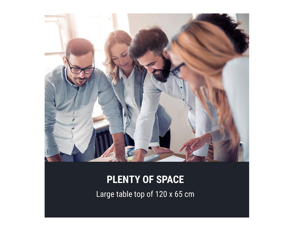 Díky ploše 120 x 65 cm nabízí deska psacího stolu mnoho místa a umožňuje tak pohodlnou práci. Aby vydržela zatížení počítače nebo hor dokumentů, je 2 cm silná deska vyrobena z vícevrstvých multiplex desek a je opatřena melaminovým povrchem, který je odolný vůči škrábancům a je snadno omyvatelný.