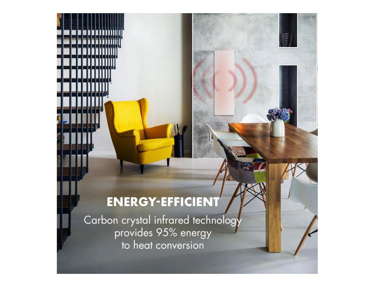 Nejnovější technologie k vytvoření příjemného tepla: infračervený ohřívač Klarstein Wonderwall přináší teplo do každé místnosti velmi efektivním a prostorově úsporným způsobem. Infračervený ohřívač Wonderwall představuje revoluci ve vytápění díky moderní technice. Velmi plochý výhřevný panel s velikostí 30 x 100 cm lze zavěsit přímo na stěnu nebo strop, díky čemuž představuje maximálně prostorově úsporné topné řešení. S výkonem 300 W šíří k lidské pokožce velmi příjemné infračervené teplo, které je vyzařováno cíleně na osoby v blízkosti ohřívače. Topný panel je zároveň velmi energeticky úsporný: Díky technologii IR Comfort Heat se přemění až 95% výkonu na tepelné vyzařování.