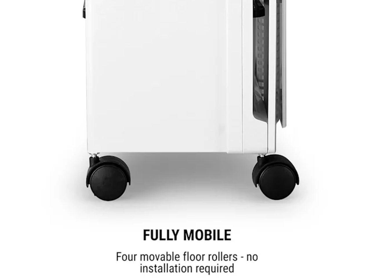 Další plus chladiče vzduchu Klarstein spočívá v úplné absenci omezení umístění, zatímco přenosné klimatizační zařízení mají odváděcí hadici na teplý vzduch, a tudíž vyžadují umístění u okna. Zařízení Klarstein Baltic Blue má 4 kolečka a na bocích párově zapuštěné úchytky.