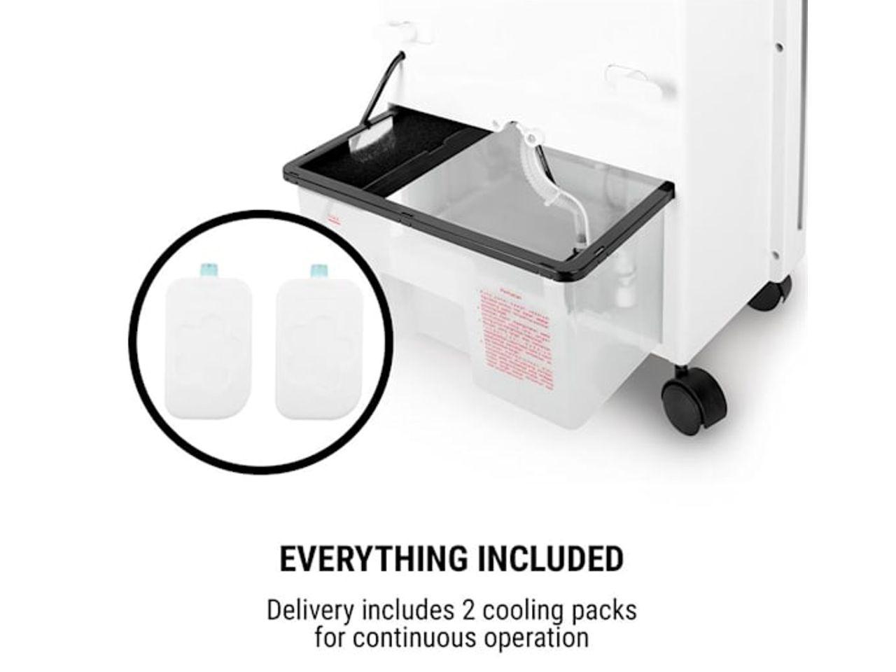 Vezměte prosím na vědomí, že při zařízení se nejedná o klimatizaci v tradičním smyslu, ale o chladič vzduchu. Chlazení foukaného vzduchu se dosahuje odpařováním vody/ledu z 6 litrů velké nádrže na vodu.