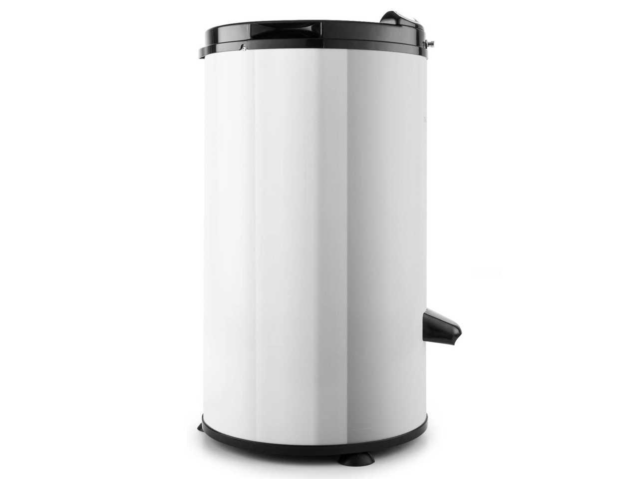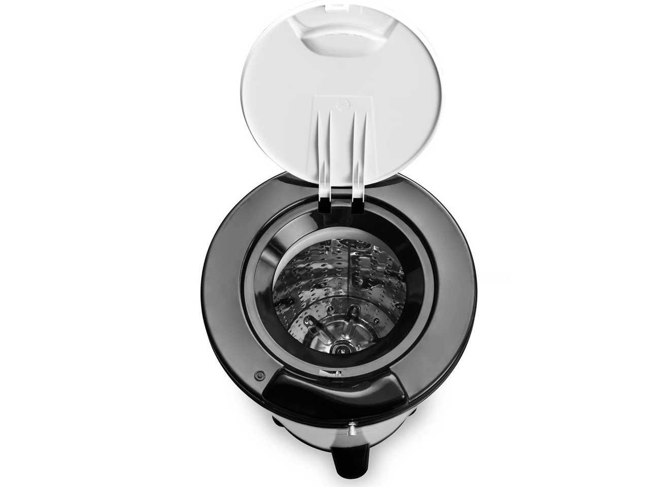Prostorově úsporné zařízení bez složitého ovládání. K otevření nakládacího otvoru slouží tlačítko na boční straně. Navzdory své kompaktní velikosti pojme buben z nerezové oceli až 6 kg prádla. Pro nastartování stačí posunout bezpečnostní páku přes uzavřený kryt a buben ždímá prádlo s rychlostí až 2800 ot/min. Běžný ždímací cyklus trvá jen 2-3 minuty, což v konečném důsledku šetří nejen čas, ale i energii. Voda vytlačená odstředivou silou odtéká a dá se jednoduše zachytit do vhodné nádoby.