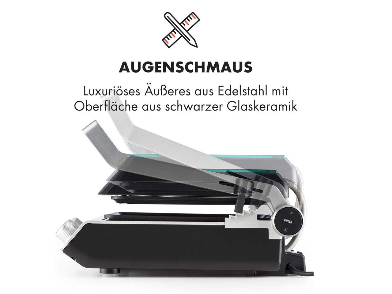 Zde jedí i oči! Klarstein Grand Gourmet 3-v-1 multifunkční gril šikovně spojuje dovednosti stolního a kontaktního grilu s panini makerem. Přitom se zahalí do roucha z ušlechtilé oceli a sklokeramiky a splní tak všechna přání co se týče designu a chutně grilovaných pochoutek. Celý popis
